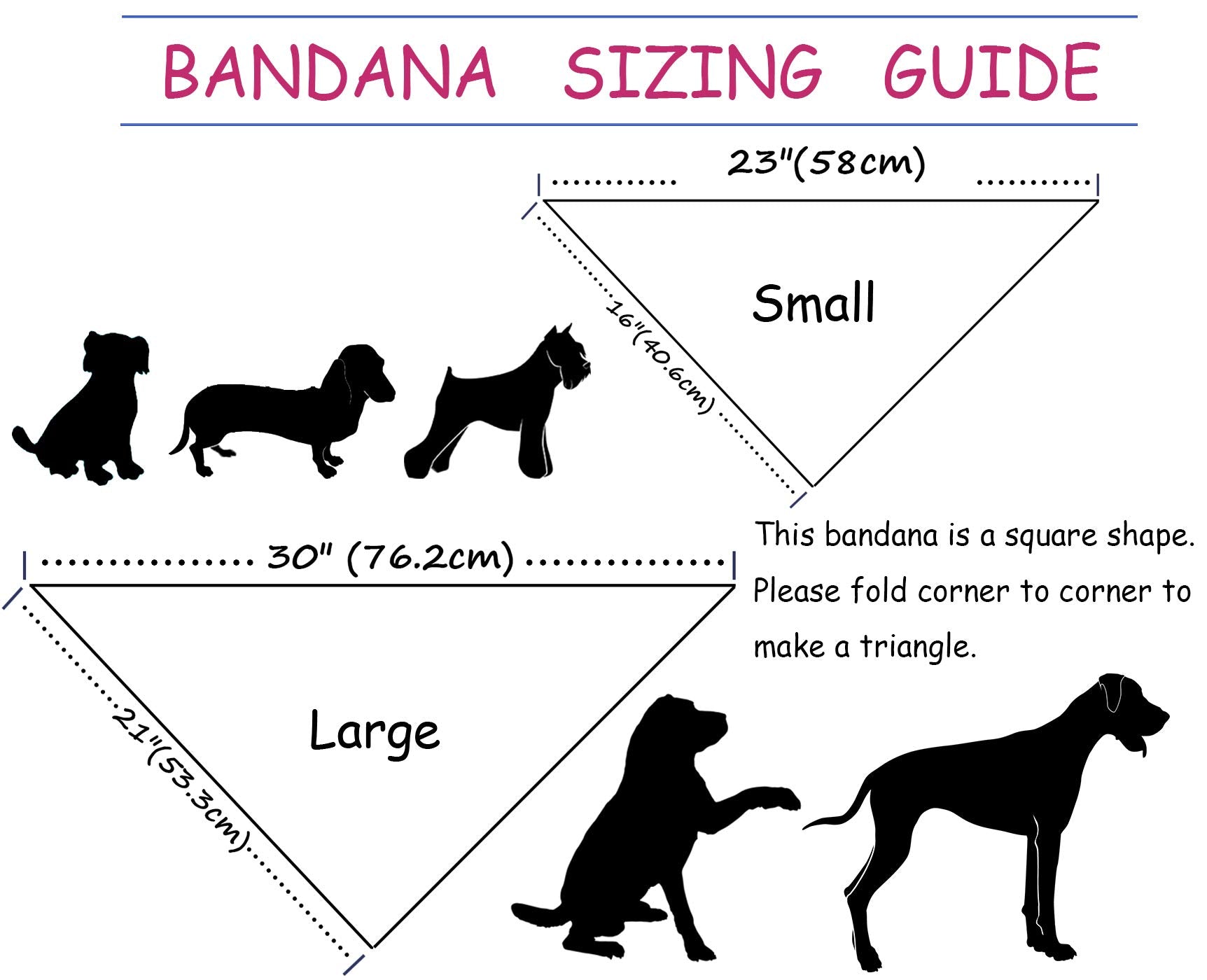 • Size L: 30' (76.2cm)*21'(53.3cm)*21'(53.3cm). Large size fits up to a 23' neck. This bandana is a square shape. Fold corner to corner to make a triangle. Please measure around your dog's neck to ensure a perfect fit