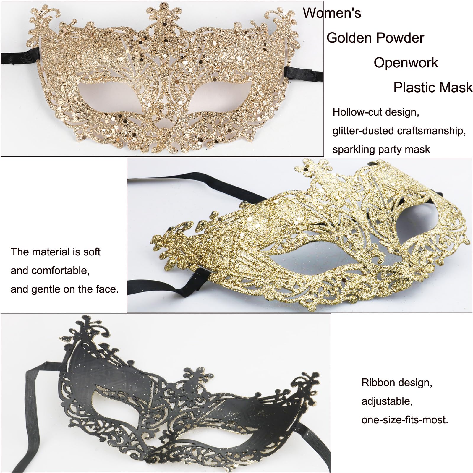 • Couple masquerade party mask set: 1pcs men black plastic mask, 1pcs women gold powder mask (Due to the mask being decorated with golden powder, you may notice some powder shedding upon receipt. This does not affect its functionality. We recommend rinsing the mask with water before wearing to remove excess powder. After the party, if any residue remains on your skin, please do not worry - it is completely harmless and can be easily washed off with clean water)