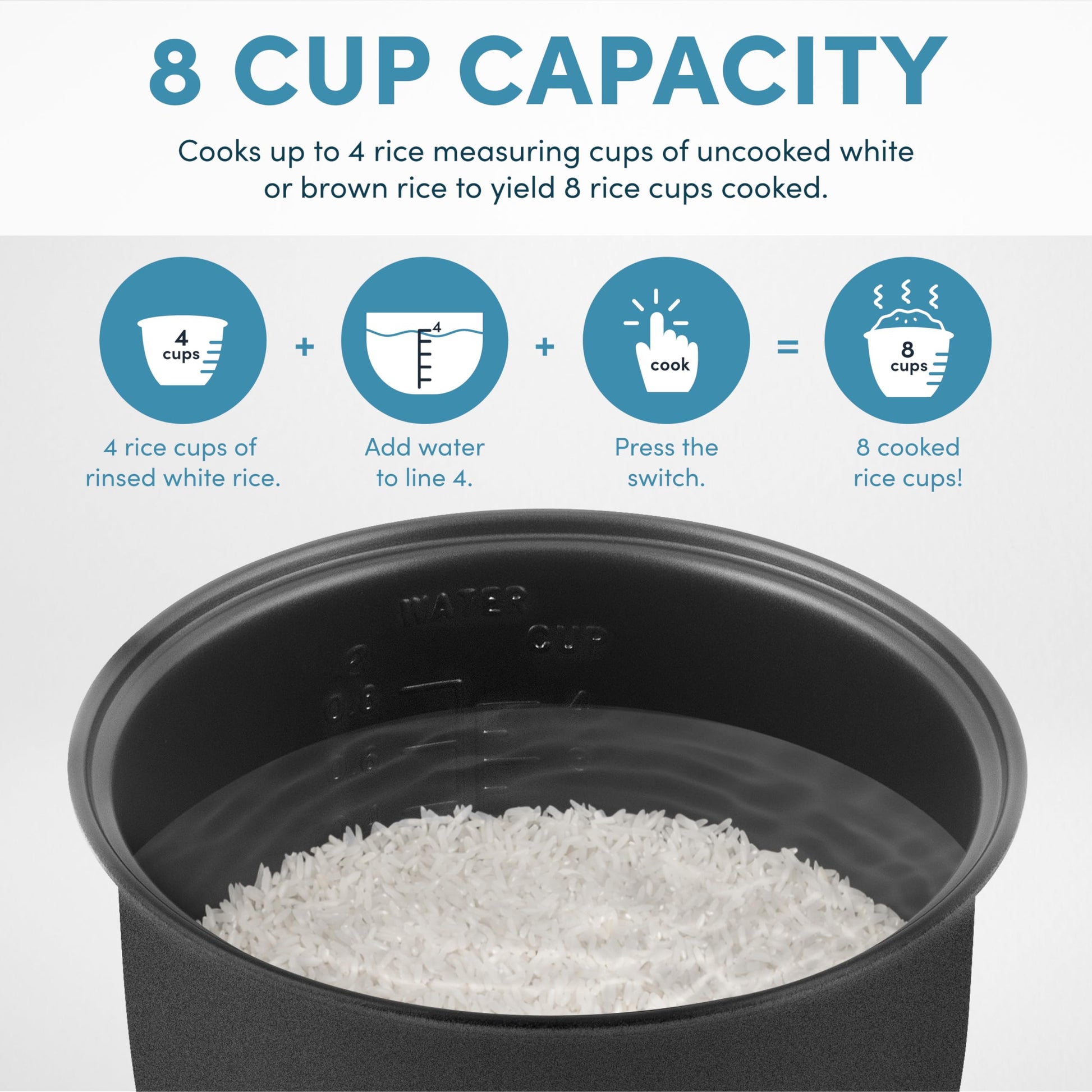 Item holds up to 2 to 8 cups of cooked rice. 8 cups is the cooked rice capacity. Rice must be cooked in the cup that comes along with this product.