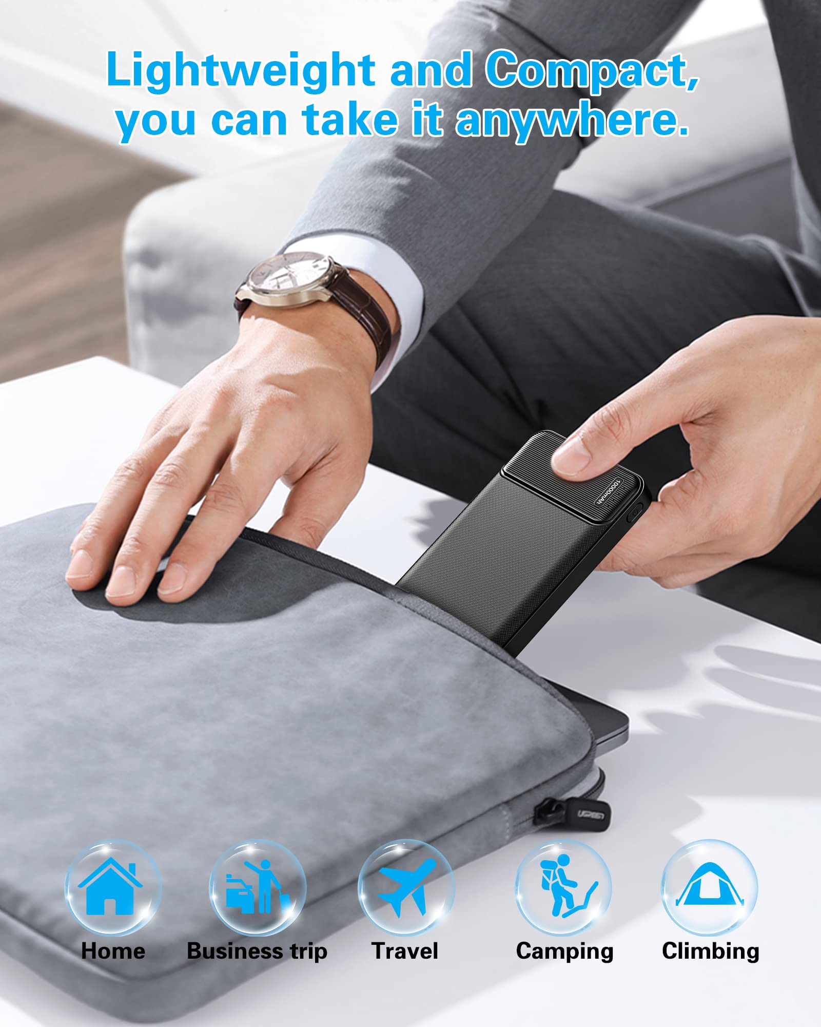 • 【Ultra-Thin】This portable battery pack is only 0.5 inches thick and weighs only 223 grams, which can be put into any backpack, purse, or work bag. Lightweight and compact, it is a must-have for business, travel, hiking, and camping