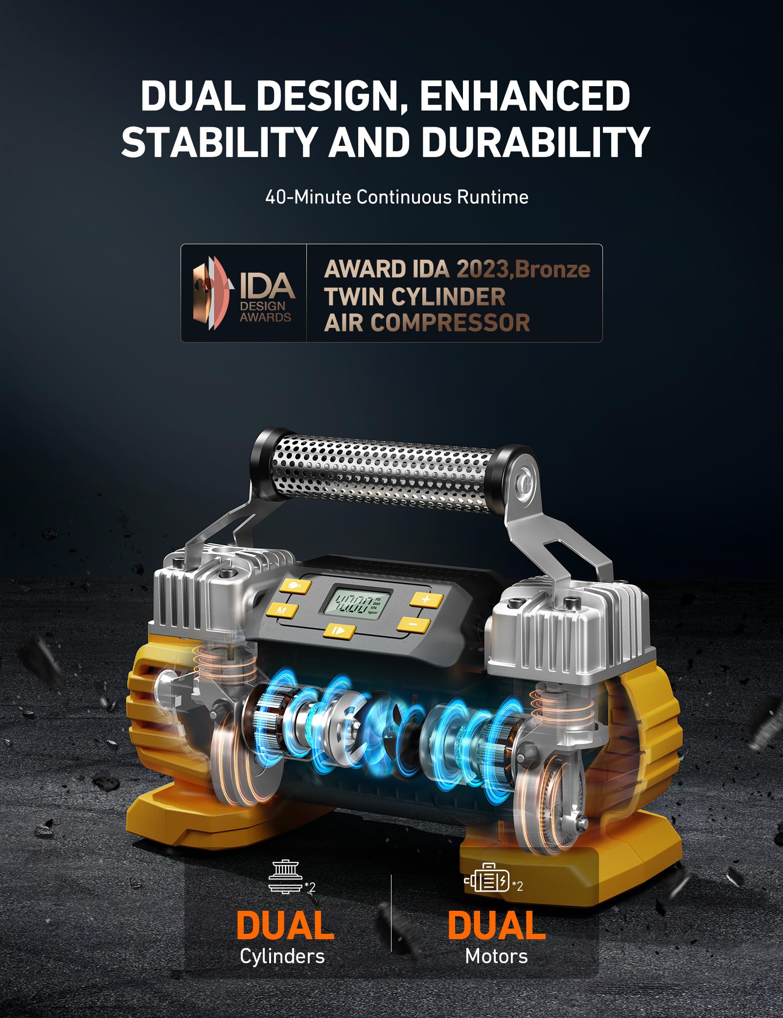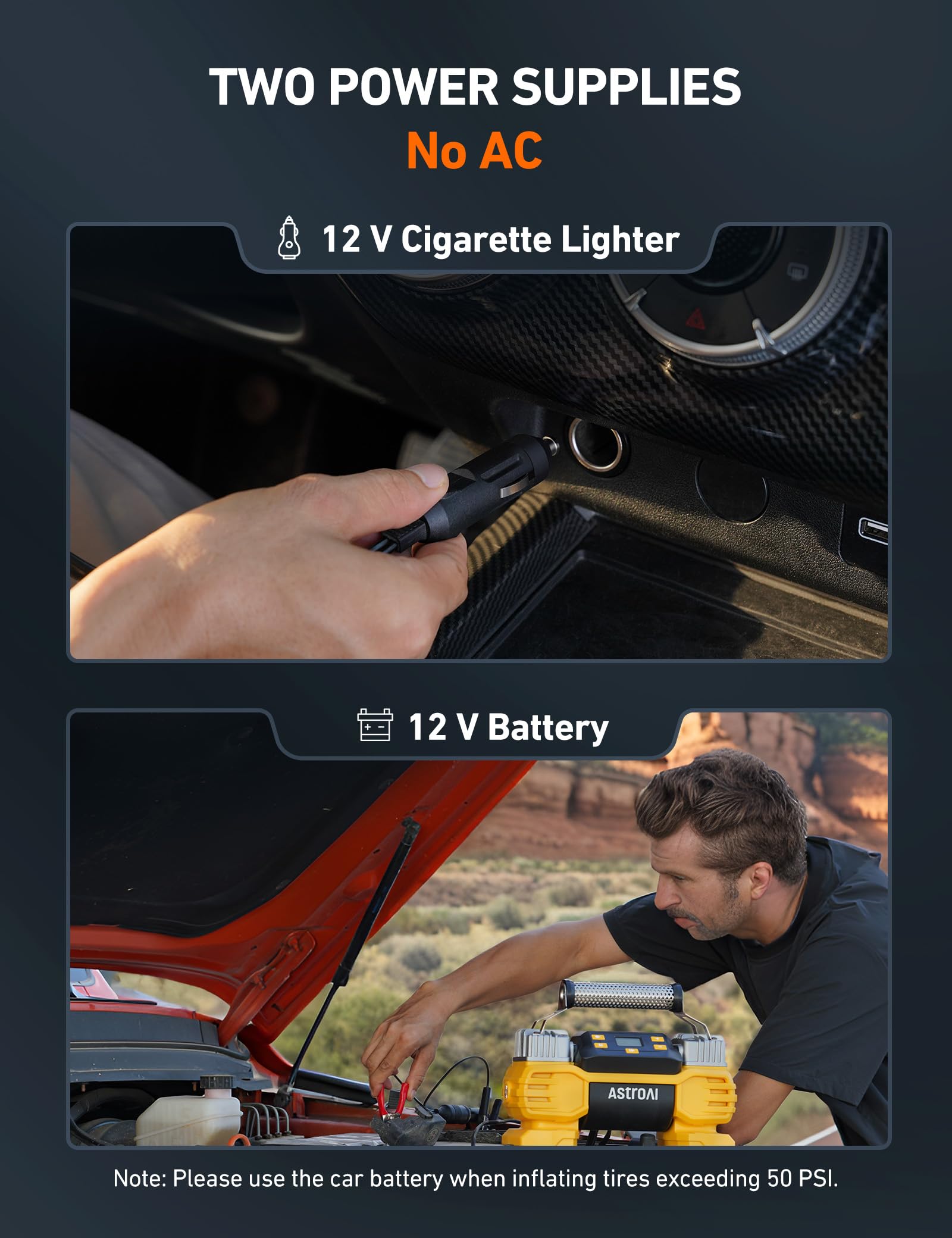 • ENHANCED STABILITY & EXTENDED RUNTIME: With dual metal motors and twin metal cylinders, the AstroAI T2 boasts improved performance and a longer continuous working time of 40 minutes, allowing for back-to-back inflation of 4+ tires, delivering enhanced and stable inflation. Only suitable for tires up to 33 inches! (Not suitable for heavy trucks/trailers)