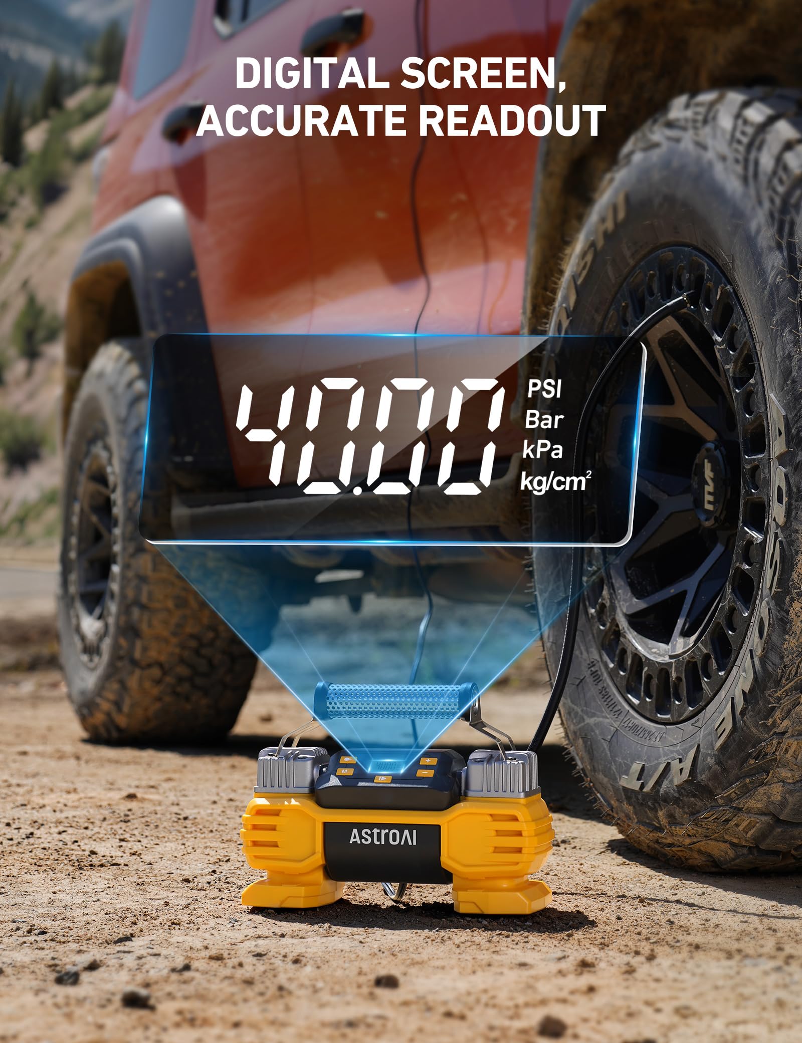 AstroAI Portable 160 PSI DC Heavy Duty Tire Inflator Pump Auto Shutoff with Screen, Dual Cylinders & Dual Motors, 12V Air Compressor for SUVs, RVs, ORVs, Cars, Air Mattresses, etc. Yellow(NO AC)