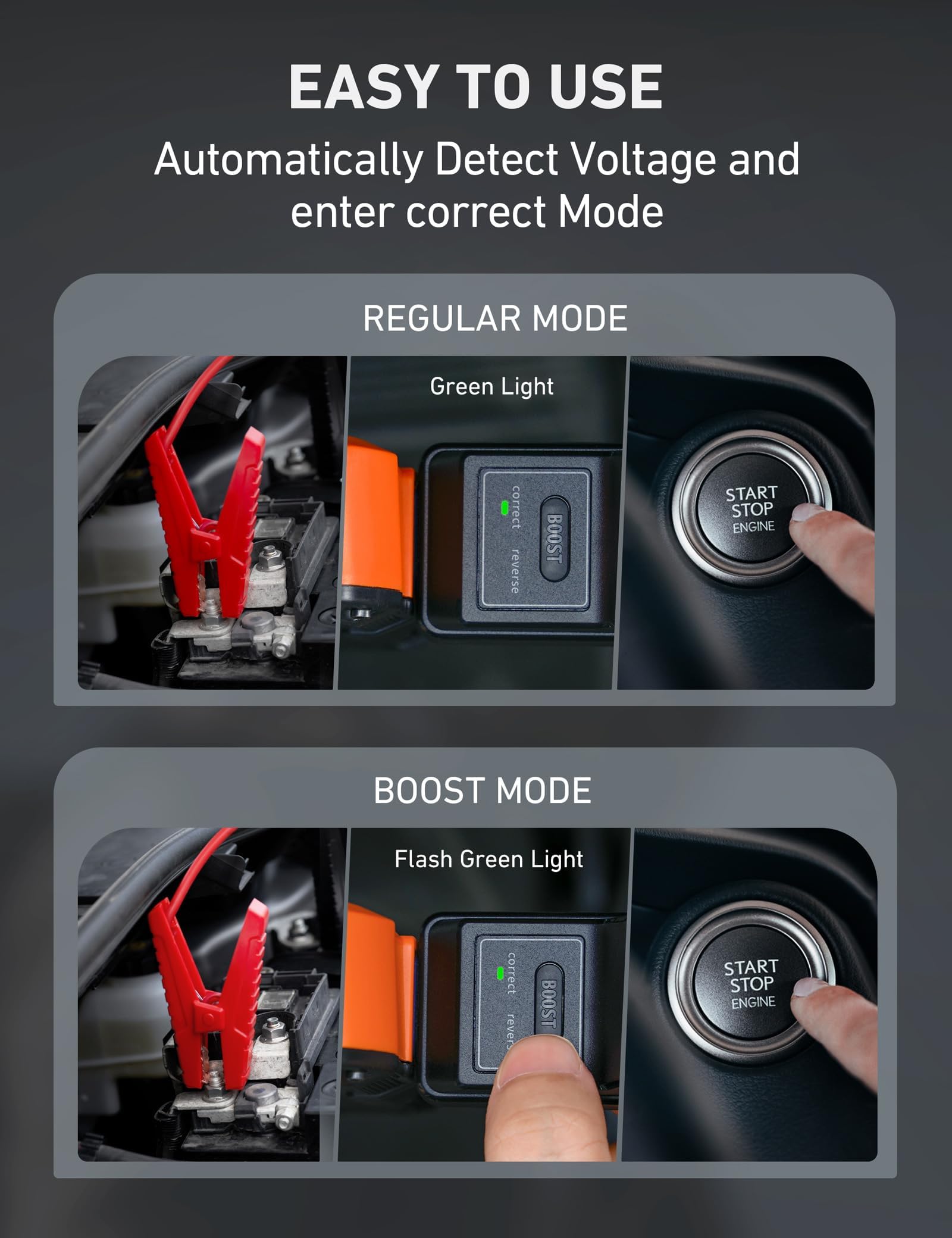 • ULTRA POWERFUL BOOST - The smart boost mode automatically detects the battery's voltage. When the voltage is less than 9 V, the indicator flashes green; this unlocks the 'BOOST' button, which can be pressed to start fully-drained batteries.
