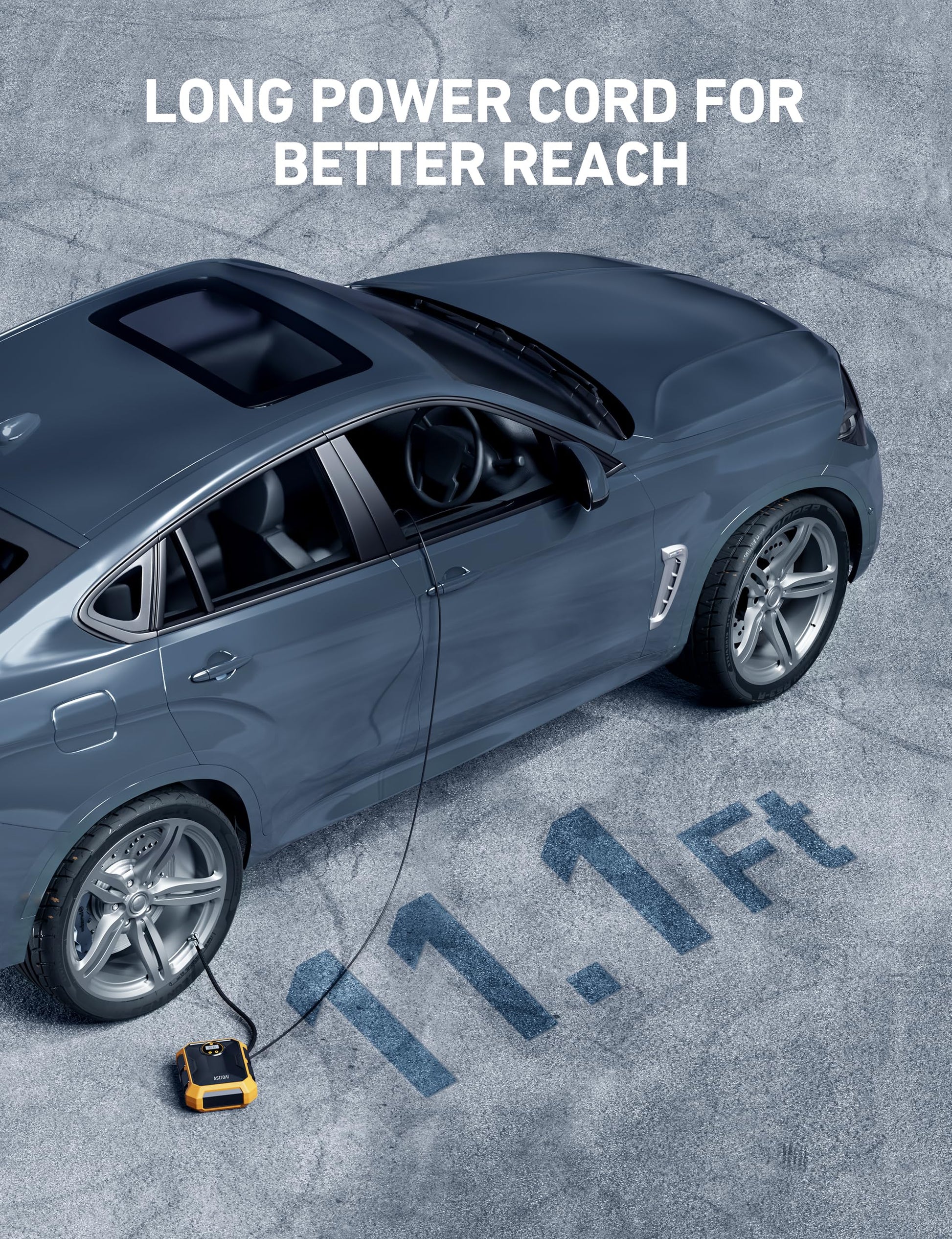• Ultra-long Power cord & Compact: The power cord plus inflation cord totals 11.1ft long overall length gives easy access to the front and rear tires, saving you time and energy. The compressor’s compact size allows it to be easily stored anywhere in a vehicle. Even though it's compact, the air compressor delivers fast inflation.