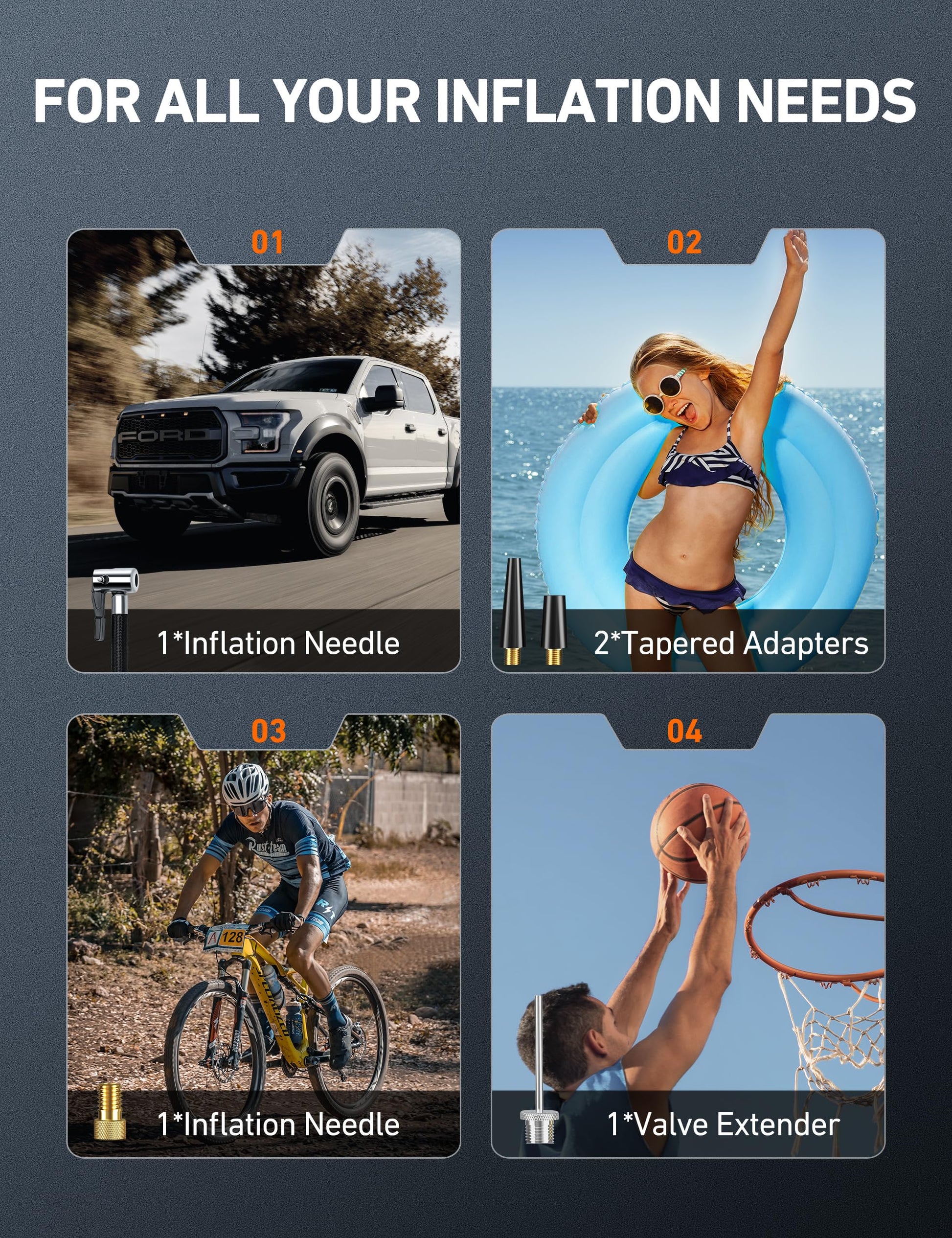 • MULTIFUNCTIONAL NOZZLES: The air compressor is equipped with 3 nozzles and 1 extra fuse. The included nozzles help the air compressor inflate a wide variety of products from tires on compact or midsize sedans,, SUVs, motorcycles and motorbikes to sports equipment like balls and more.