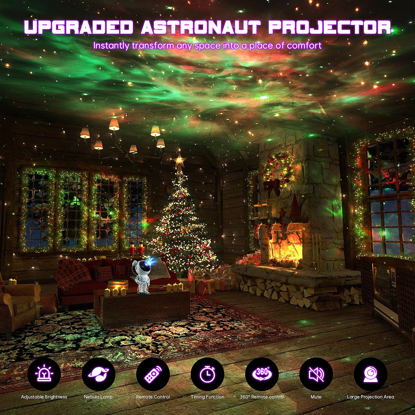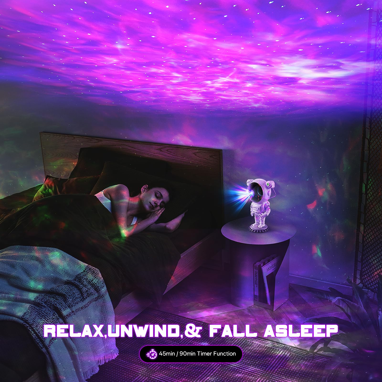• [Manual Switch, Remote Control & Timer] You have 2 ways to switch on the astronaut projector: the back buttons and the remote control. The back button can only turn on the projector, fog and star switch and long press to turn it off; the remote control can set colours, speed and brightness of fog and star, as well as the timer (45 minutes or 90 minutes automatically turn off).