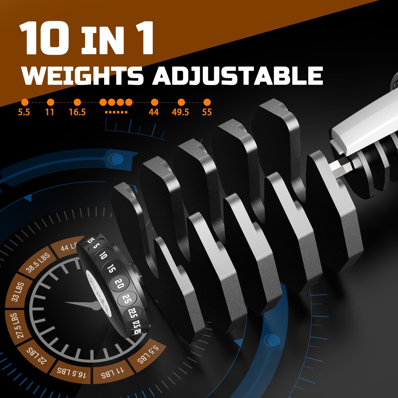 • 【10 in 1 Dumbbell Weights Adjustable】Ranging from 5.5LB to 55LB, with 10 levels of weight adjustment (5.5, 11, 16.5, 22, 27.5, 33, 38.5, 44, 49.5, 55LB), it perfectly meets the diverse needs and plans of beginners and professional fitness enthusiasts for strength training. The incremental/decremental adjustment of 5.5 pounds per level maximizes muscle stimulation while minimizing the risk of exercise-related injuries.