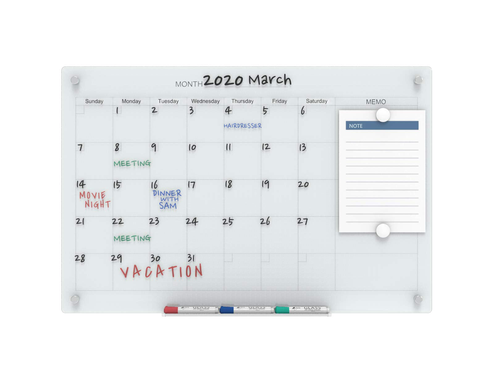 Audio-Visual Direct Magnetic Glass Dry Erase Board Set (3' x 2', Calendar White) for Wall - Monthly Planner