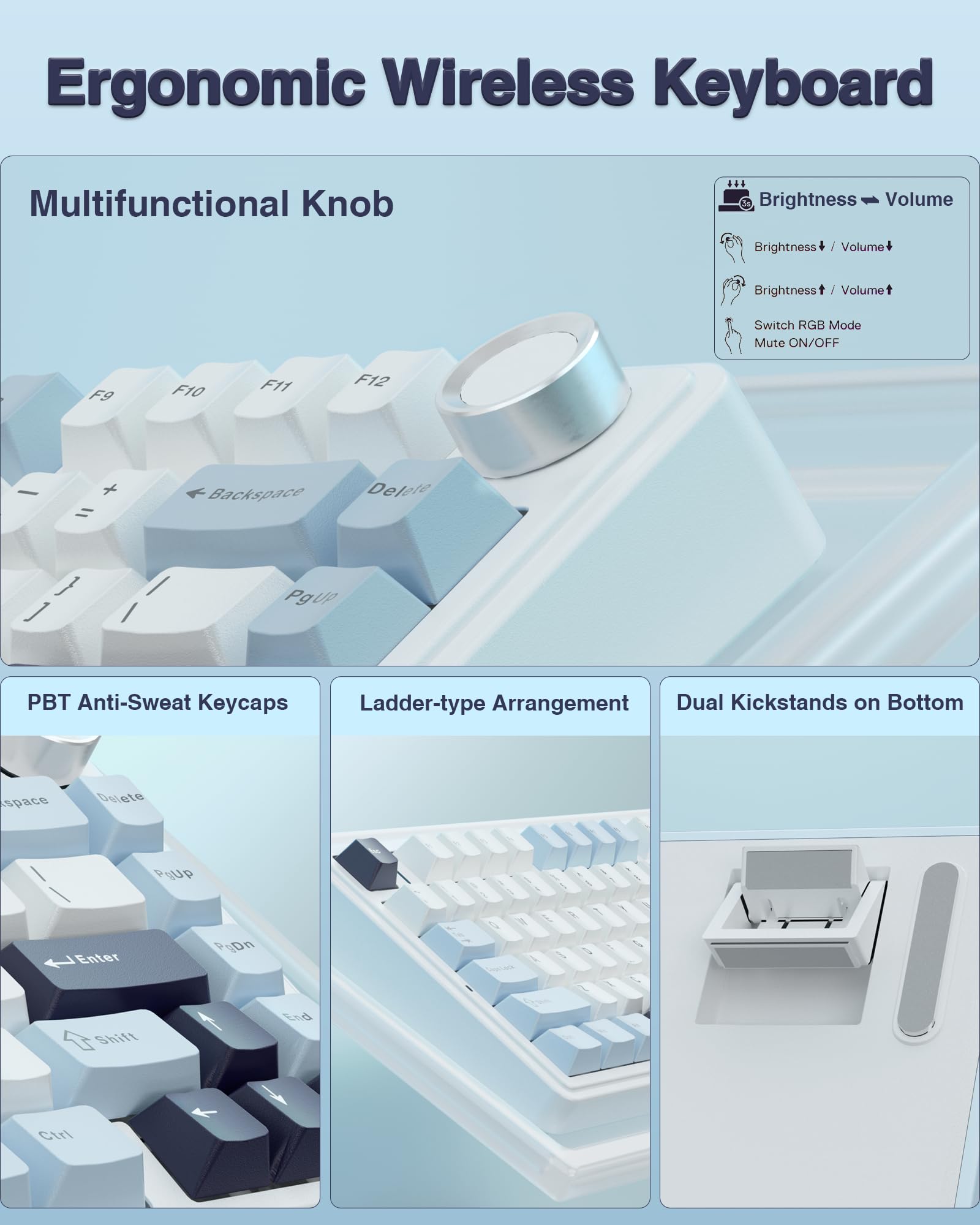 • Multi-function Control Knob: This AULA 75% wireless gaming keyboard is equipped with functional knob to switch gaming mode or office mode. In gaming mode, you can rotate the knob to adjust the brightness of the lights, and click the knob to switch the lighting effects easily; in office mode, rotate the knob to adjust the volume, and click the knob to play or pause. Long press the knob for about 5 seconds to switch modes