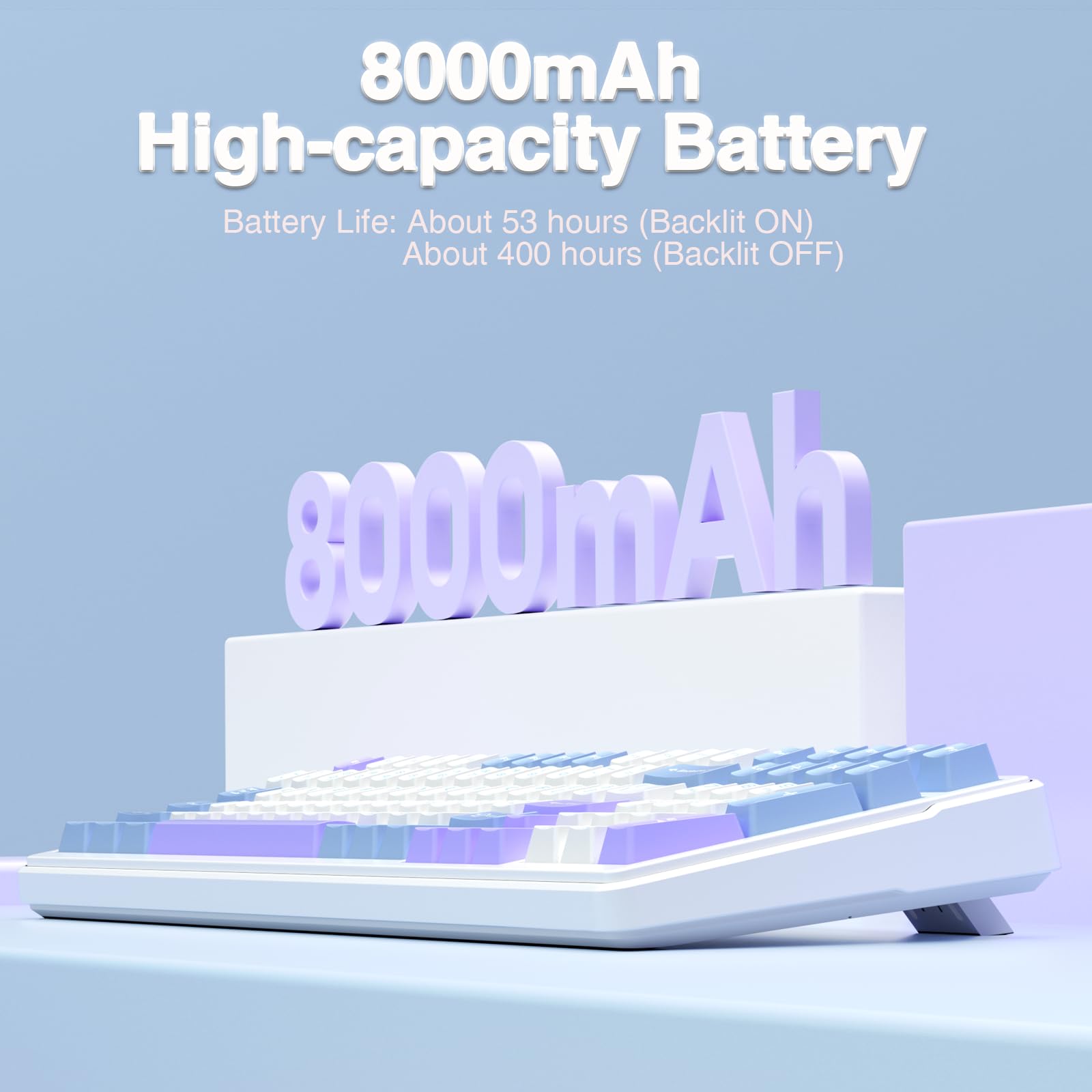 • PBT Keycaps and 8000mAh Battery: 99 keys 96% layout compact keyboard can save more desktop space while keep necessary arrow keys and number area for games and work. The rechargeable keyboard built-in 8000mAh large capcacity battery to provide more power and longer battery life. Double shot PBT keycaps, made from two colors material molded into each others, make the keycaps characters maintain the vibrance and saturation, clear and not fade