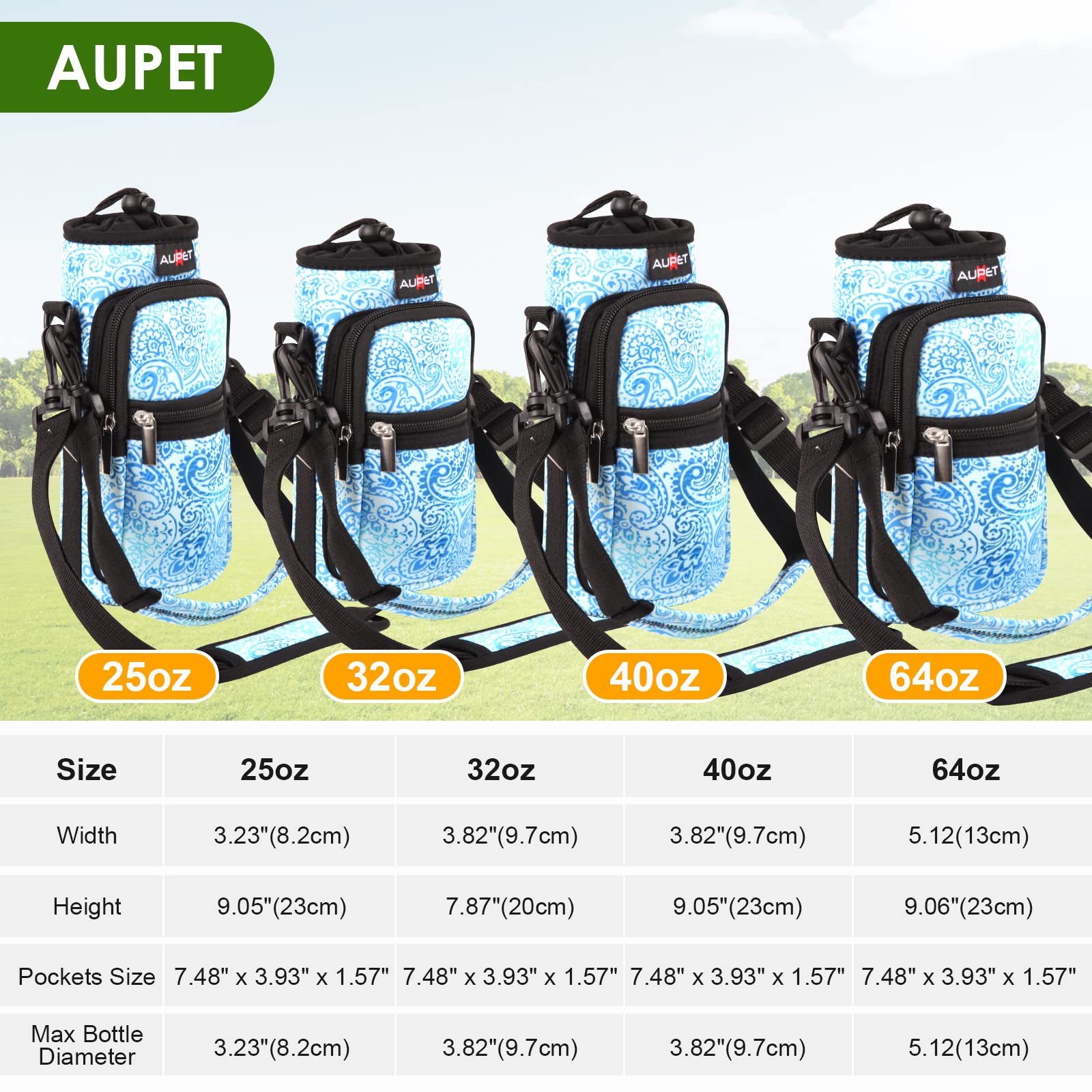 • AVAILABLE IN FOUR SIZES:Our AUPET water bottle crossbody bags has four sizes for you to choose,25oz/32oz/40oz/64oz,please refer to the picture to choose the right size