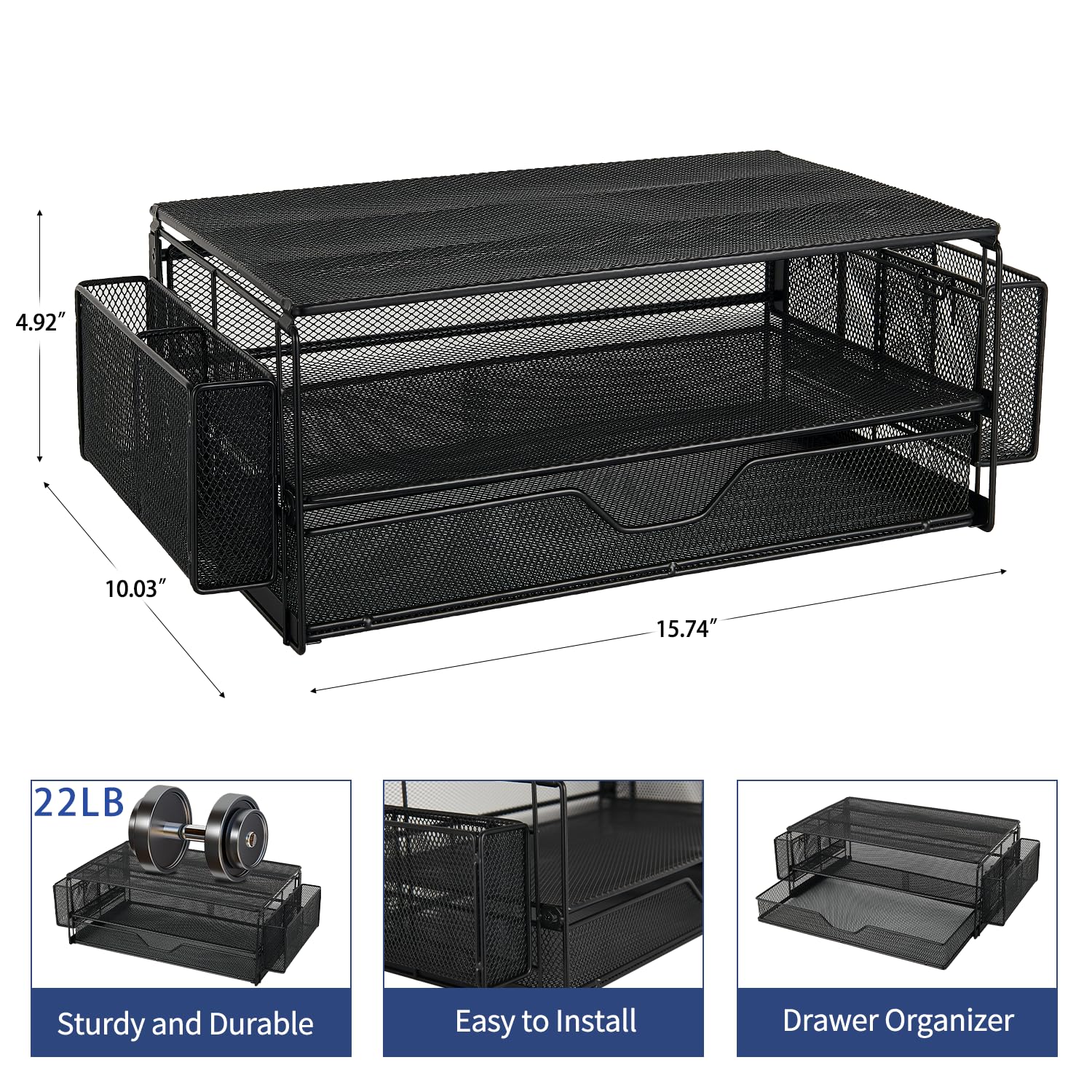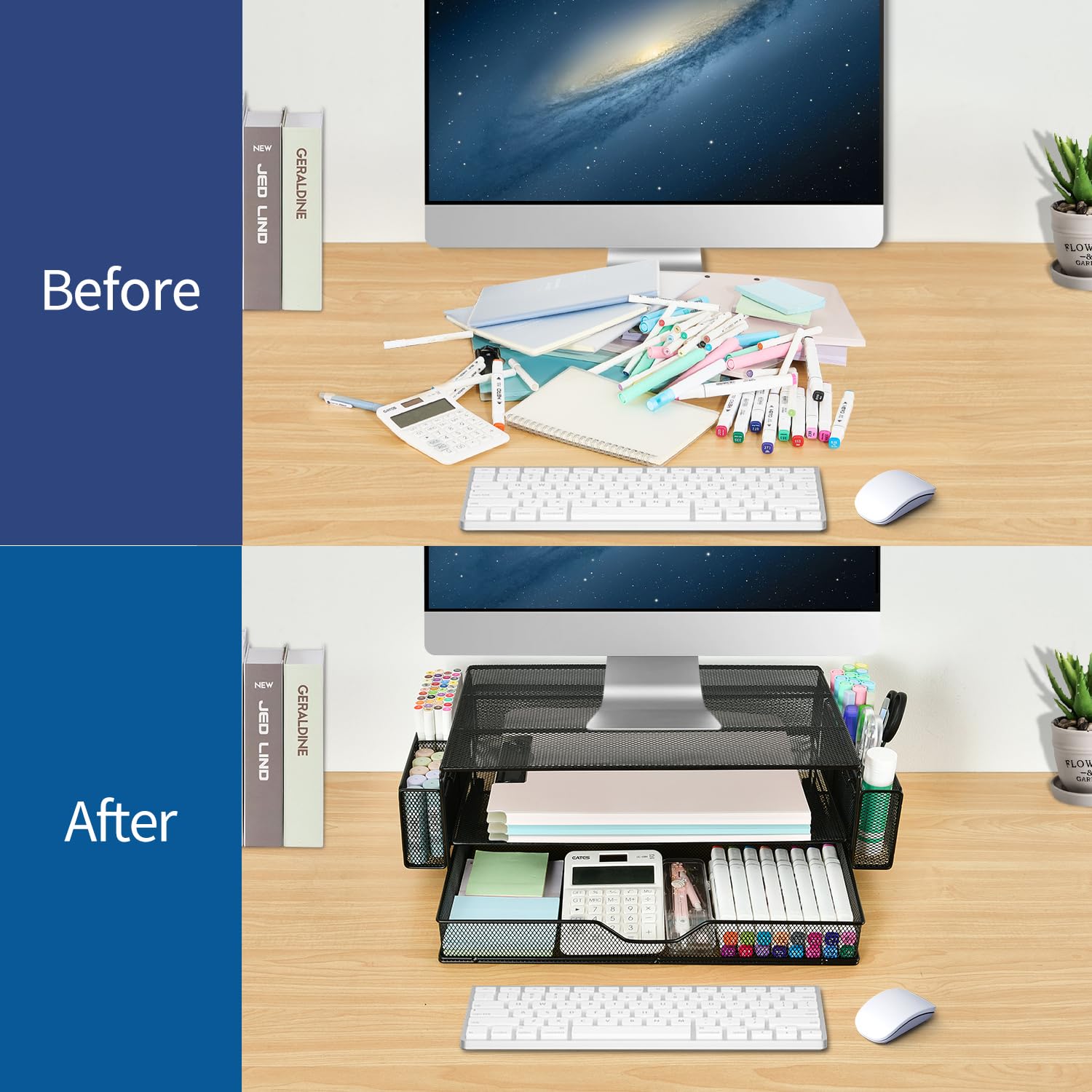 • Space Saving: Our dual-tier desktop organizer with drawer and 2 pen holders stores office supplies and office desk accessories neatly. As a purpose monitor riser, it keeps your workspace organized, helping you focus and work efficiently