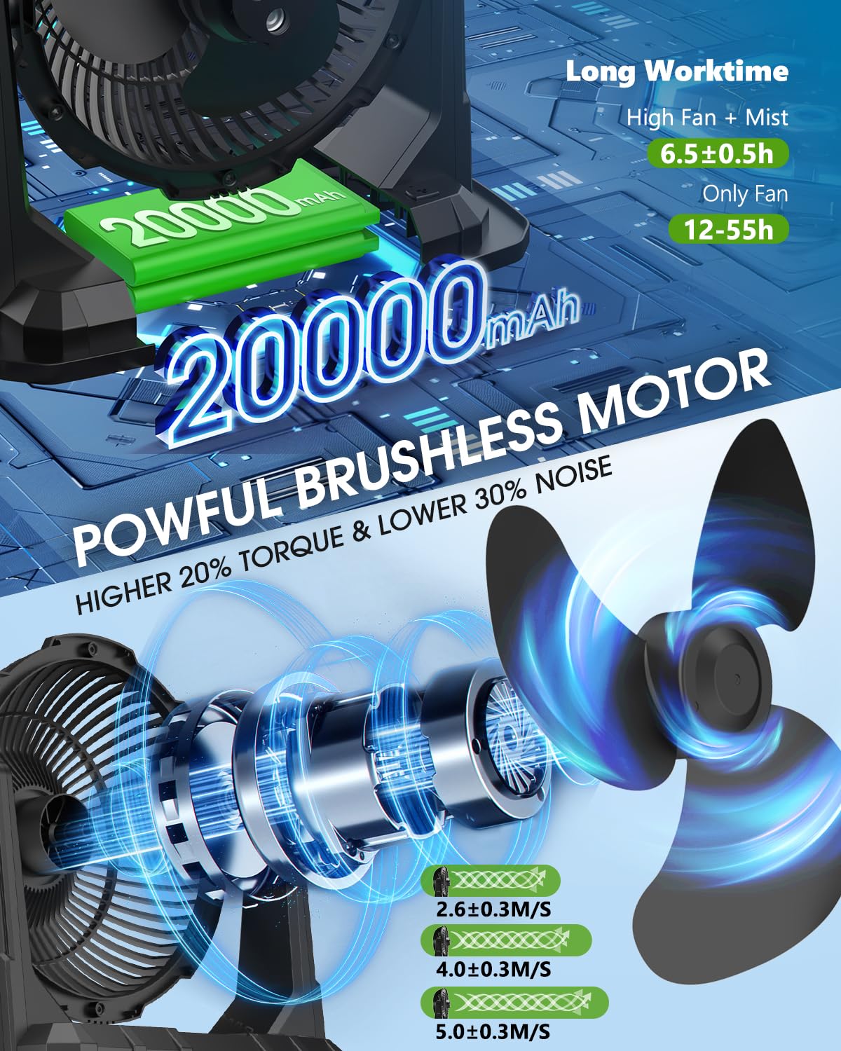 • ⭐【20000mAh Built-in Battery】- With its built-in 20,000mAh rechargeable battery, this battery powered fan delivers 6-7hrs (High Fan+Mist) or 12-55hrs (Only fan) of runtime after 9.5 hours fully charged. Meet your long-time outdoor works and vacation essentials needs.