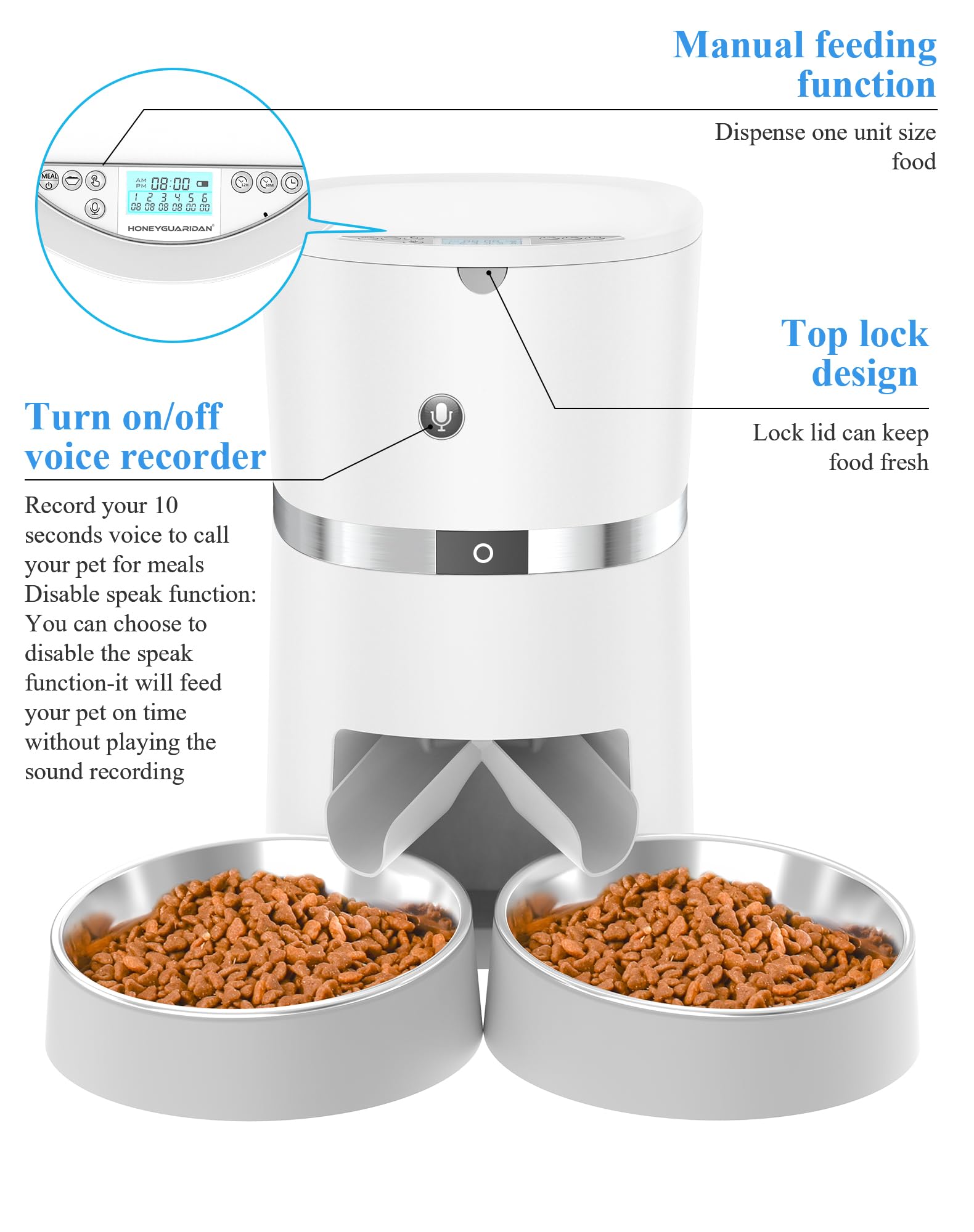 • 【Upgraded 10s Meals Call】- You can record 10s customized voice message calling your pet at each feeding dispenses to let your pet know when it’s time to eat. And it dosen’t feel lonely as he can hear your voice recording. You can also disable the recorder sound for your smart pet to have a good sleep on the weekends.