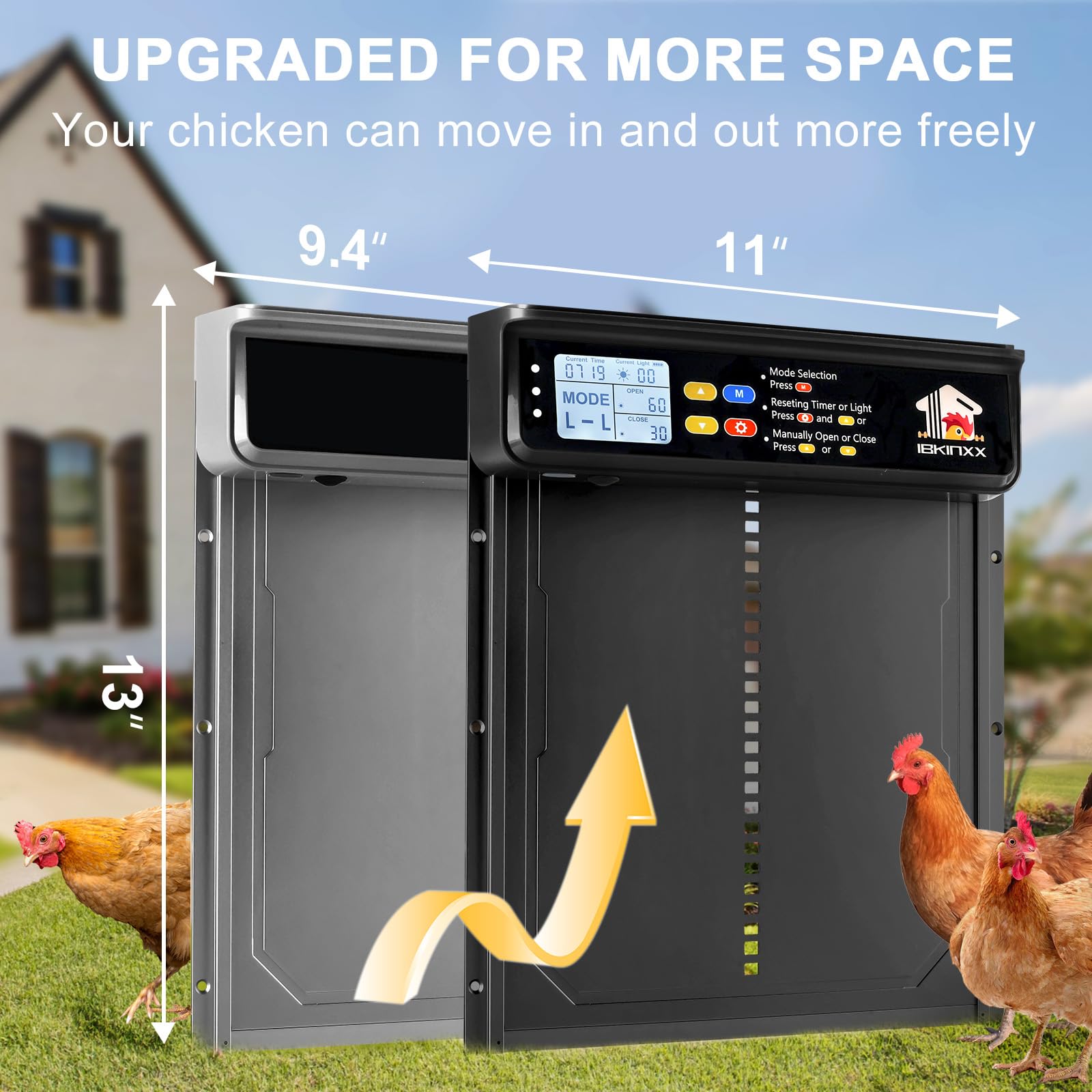 • Wider Size for Stress-Free Access: Our solar-powered automatic chicken door is upgraded wide size, giving your flock plenty of space to move in and out freely—no more crowding or delays! Compared to other chicken doors on the market, this design ensures smoother, stress-free access for your chickens, making it the smarter choice for a happier, healthier flock