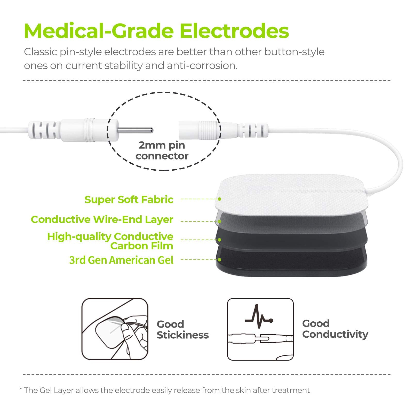 • 10 Upgraded TENS Unit Pads: The low-impedance solid gel has been upgraded to the industry-leading American adhesive, which can provide much better self-stick performance and easy clean-up after 45 uses for a longer lifespan. Standard 2mm connector lead wires and electrodes are classic and commonly used in the medical area, which makes it easier for you to find compatible accessories