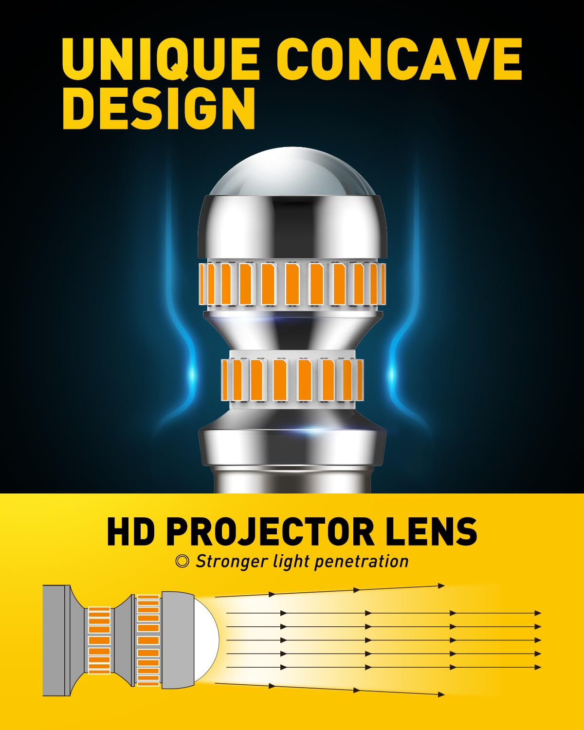 • Unique imitated halogen shape design. Resembling halogen bulb shape design and sequencing 54 pieces 4014-SMD LED chips precisely around the light. Delivering 360° high luminous efficiency with full amber light, easier to be noticed and safer to drive