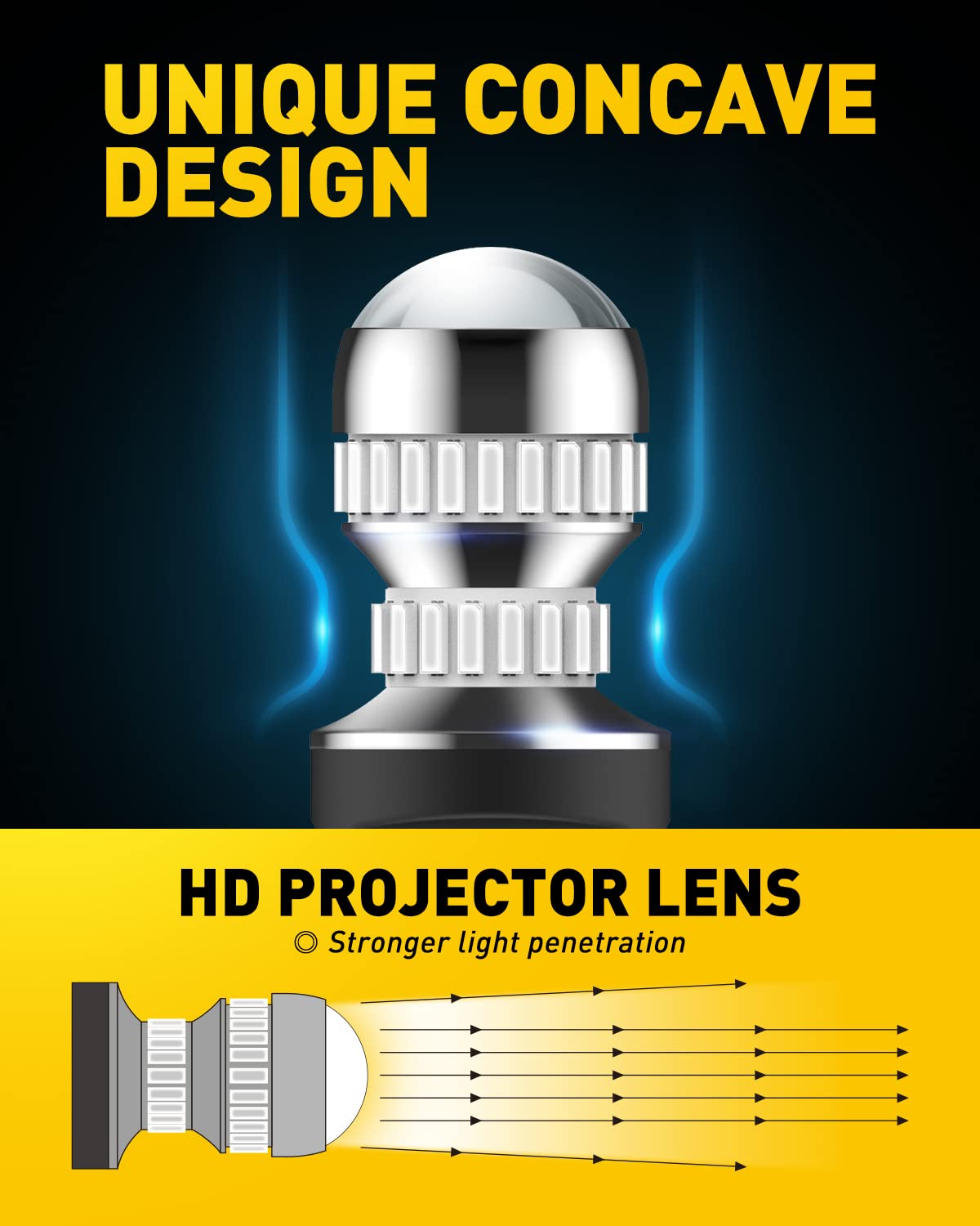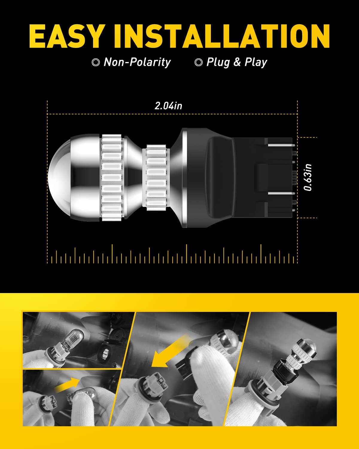 • Unique imitated halogen shape design. Resembling halogen bulb shape design and sequencing 54 pieces 4014-SMD LED chips precisely around the light. Delivering 360° high luminous efficiency with full amber light, easier to be noticed and safer to drive