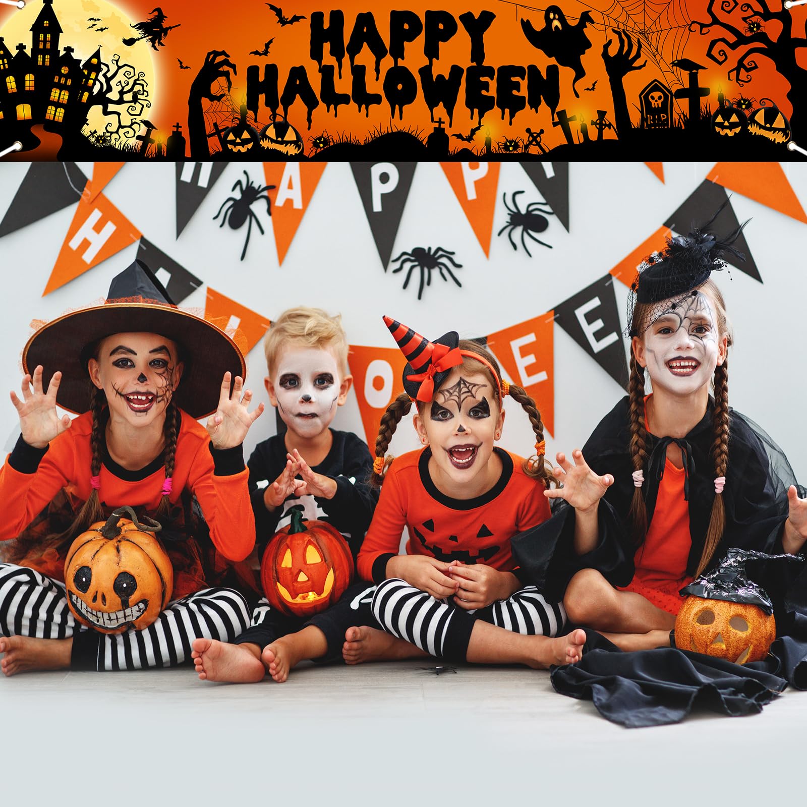 Avezano Happy Halloween Banner Large 98.4 x19.6 Inch Yard Sign Banner Black and Orange Halloween Party Decorations Welcome Hanging Flag Outdoor Fence Garage Garden Porch Holiday Backdrop