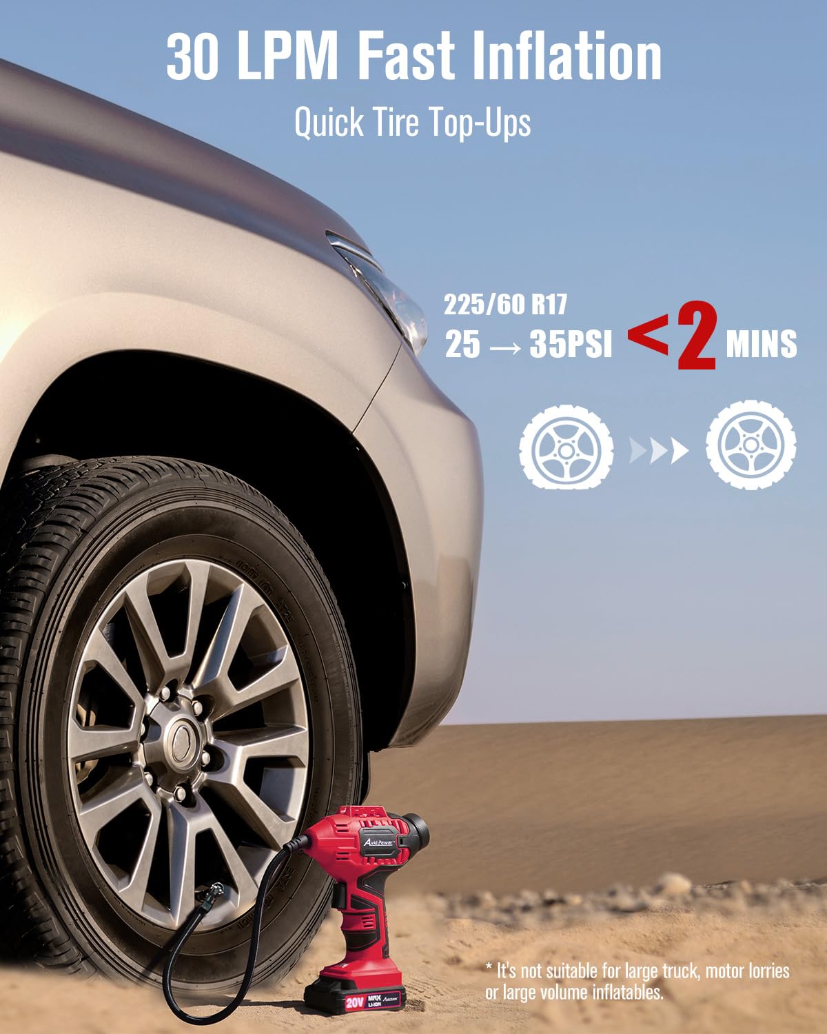 • [Multipurpose] This handheld air compressor is compatible with cars, motorcycles, bicycles, sport balls and small inflatable pool toys. Note: It's not suitable for high-volume inflatables, paddleboards, rafts. And not recommended for vehicle tires wider than 245mm or requiring over 50PSI