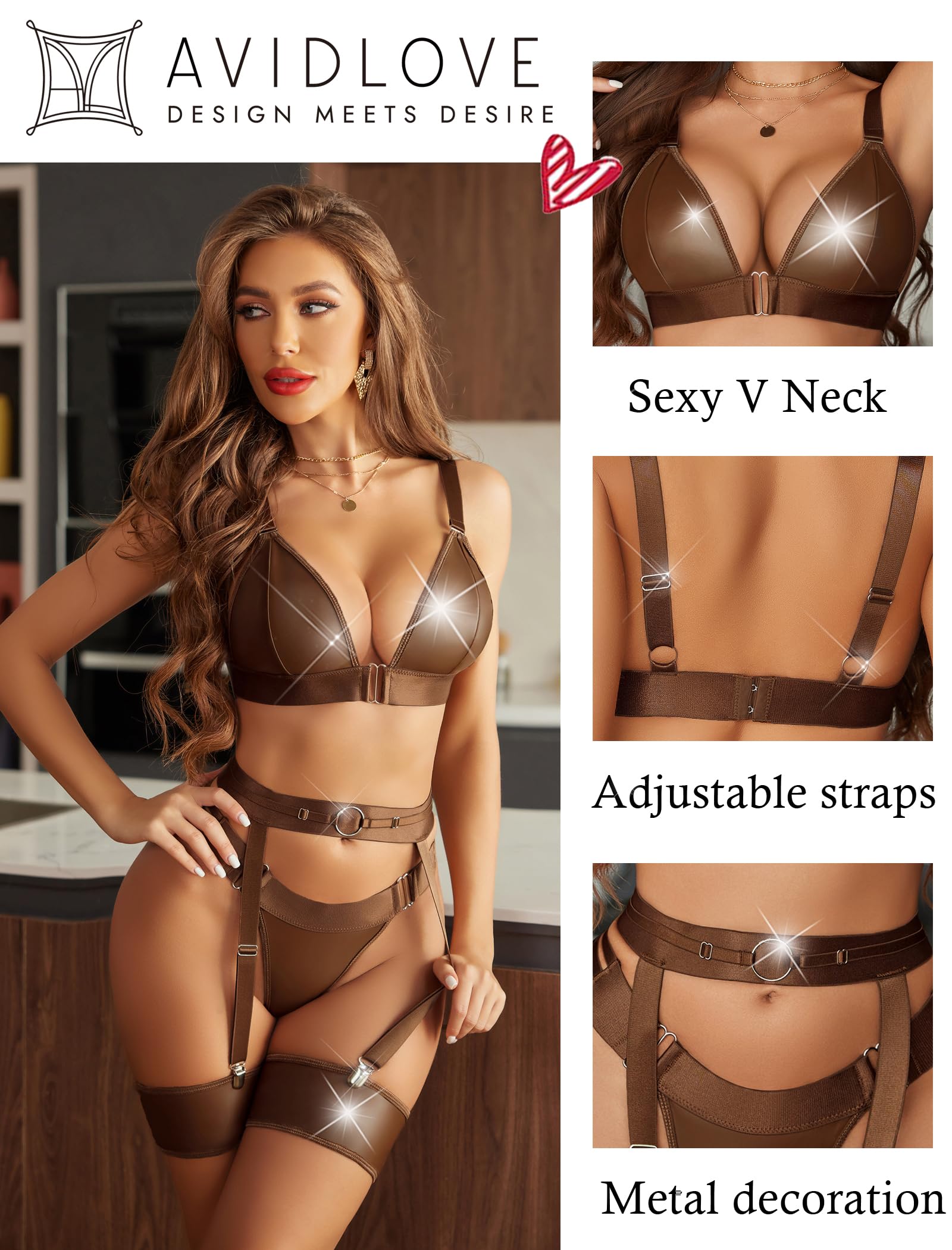 Avidlove Straps Lingerie for Women Leather Babydoll Nightgowns (Medium, Coffee Brown)