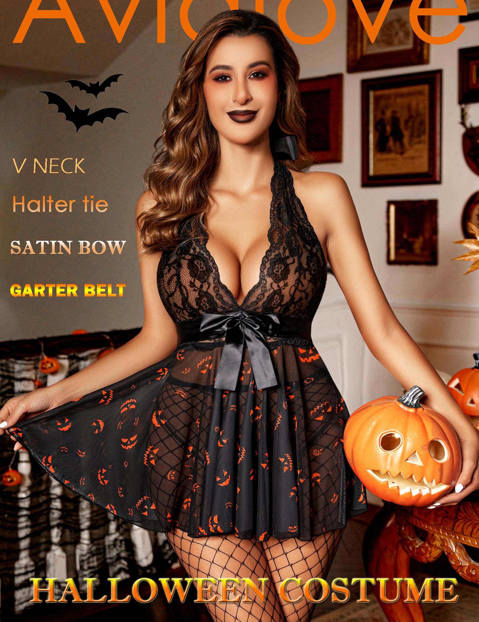 Avidlove Women's Lingerie Sexy Babydoll Sleepwear Halter V Neck Lace Chemise Halloween Graphic Lingerie L