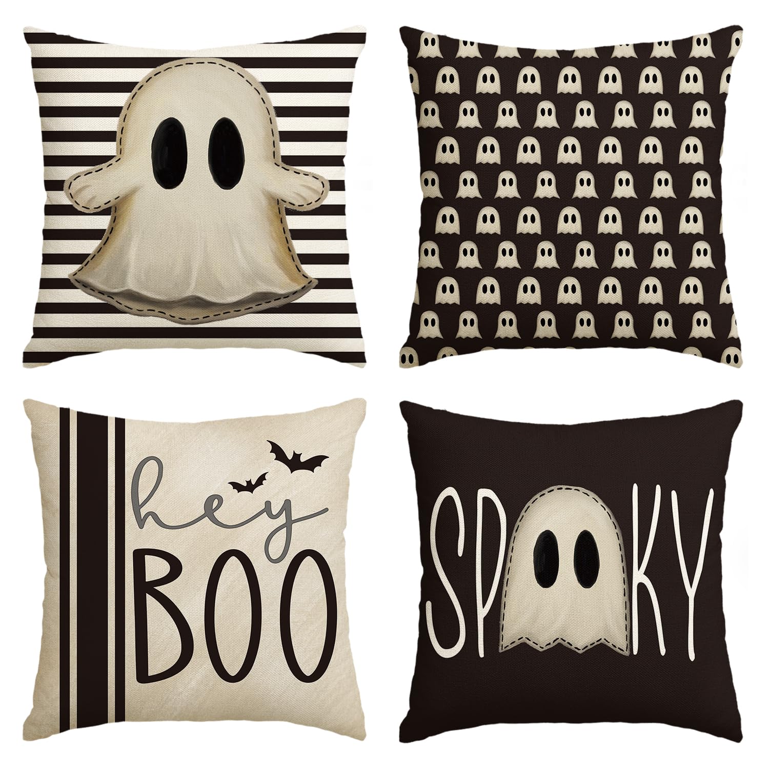 AVOIN colorlife Halloween Hey Boo Cute Ghost Spooky Throw Pillow Covers, 18 x 18 Inch Horror Scary Cushion Case for Sofa Couch Set of 4, Black