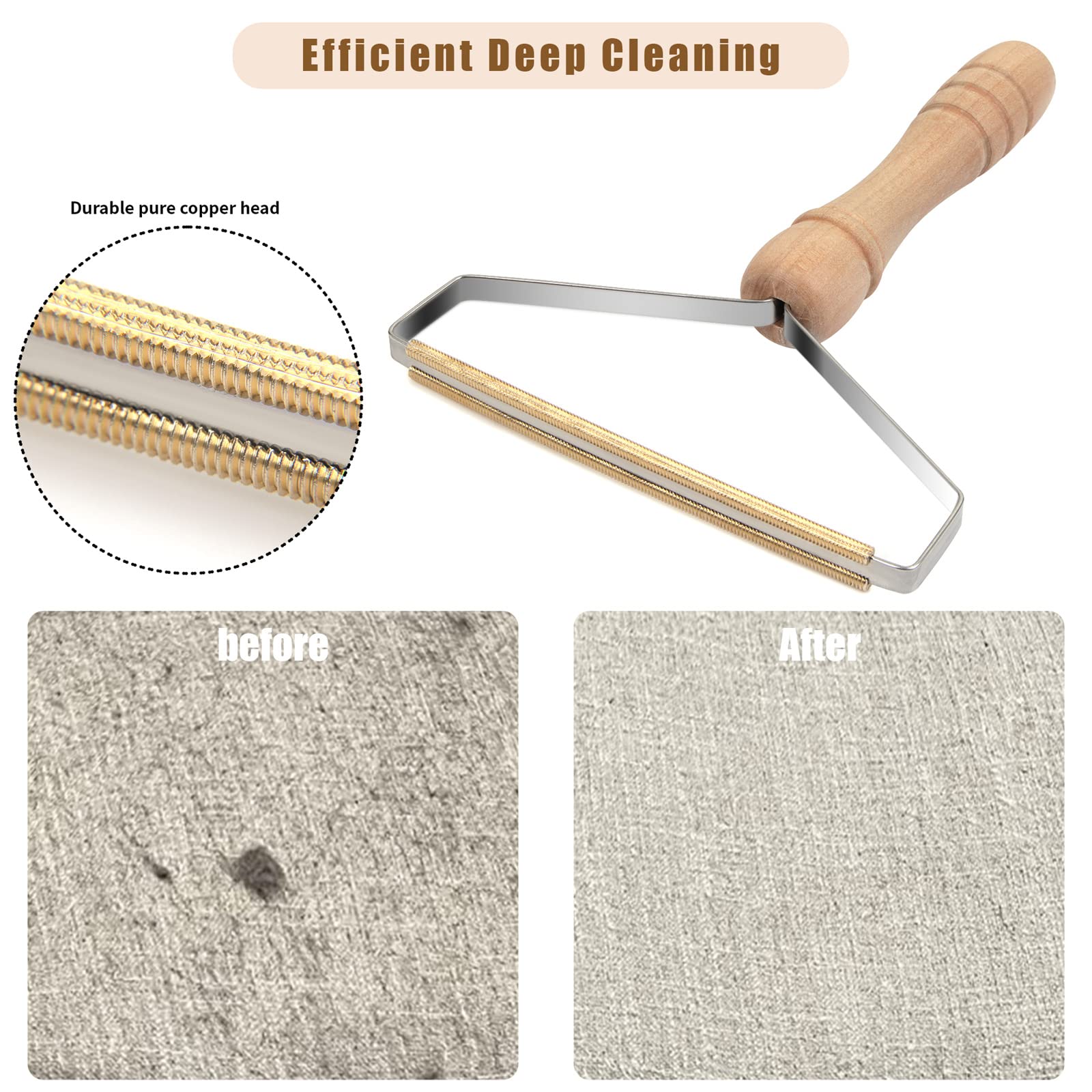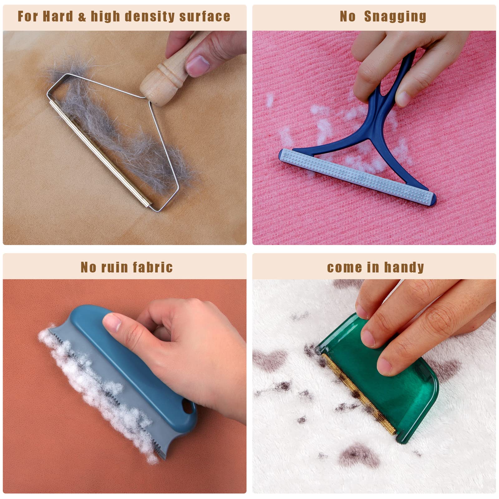 • WIDE RANGE OF APPLICATIONS - The wooden handle one suitable for carpet, couch, rugs, car upholstery, furniture, car seats and clothes (DO NOT USE IT ON MESHED KNITTED OR DELICATE FABRICS). The Smallest one suit for tweed coat (NOT FOR SWEATER) The left two lint remover are suitable for delicate surfaces like low density knitted or wool to remove pilling. When you scrape things with different materials,you can try a bit then select the most suitable lint remover.