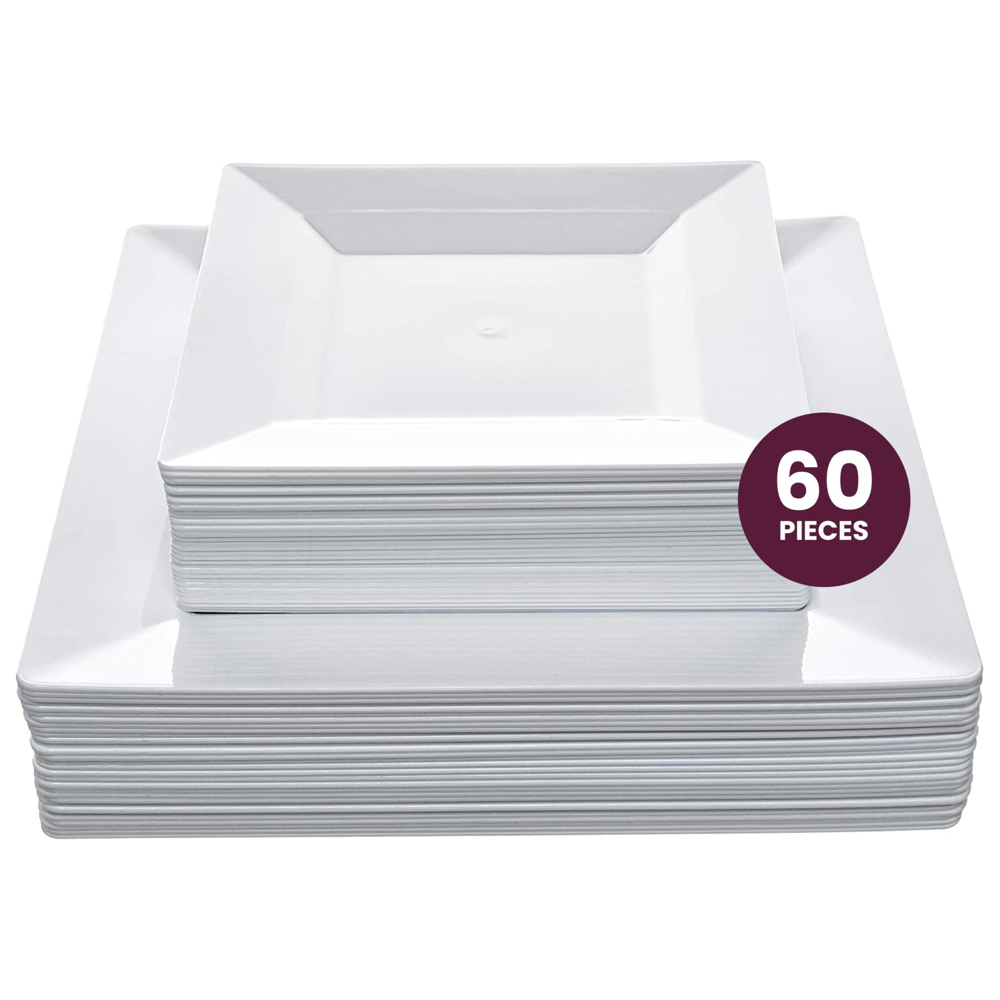 Aya's 60ct White Square Disposable Plates - Heavy Duty Plastic Party Plates for Christmas, Thanksgiving (30 Dinner & 30 Salad)