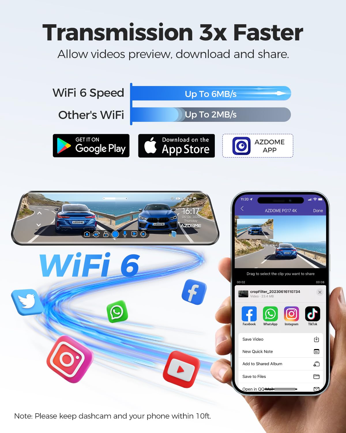 • Built-in WiFi6 - Users can simply download AZDOME app and connect dash cam to easily manage and view recordings on their smartphone. WiFi6 ensures a smoother video playback and faster download speeds, allowing user to easily share their travel experiences and wonderful moments on social media with friends and family.