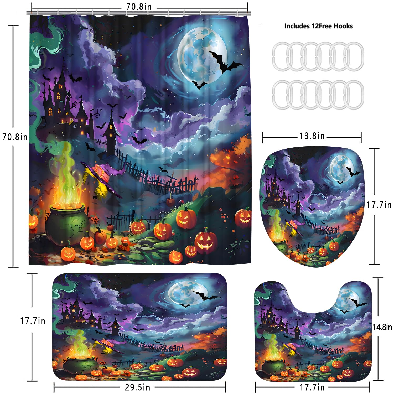 • FULL 4-PIECE SET: This halloween Shower Curtain Set includes everything you need for a stylish bathroom upgrade - 1 shower curtain(70.8' l x 70.8' w), 1 bath mat(29.5' l x 17.7' w), 1 toilet cover(17.7' l x 13.8' w), 1 U-shaped toilet mat(17.7' l x 14.8' w) and 12 hooks. Add a beautiful touch of color to your bathroom while meeting your daily needs.
