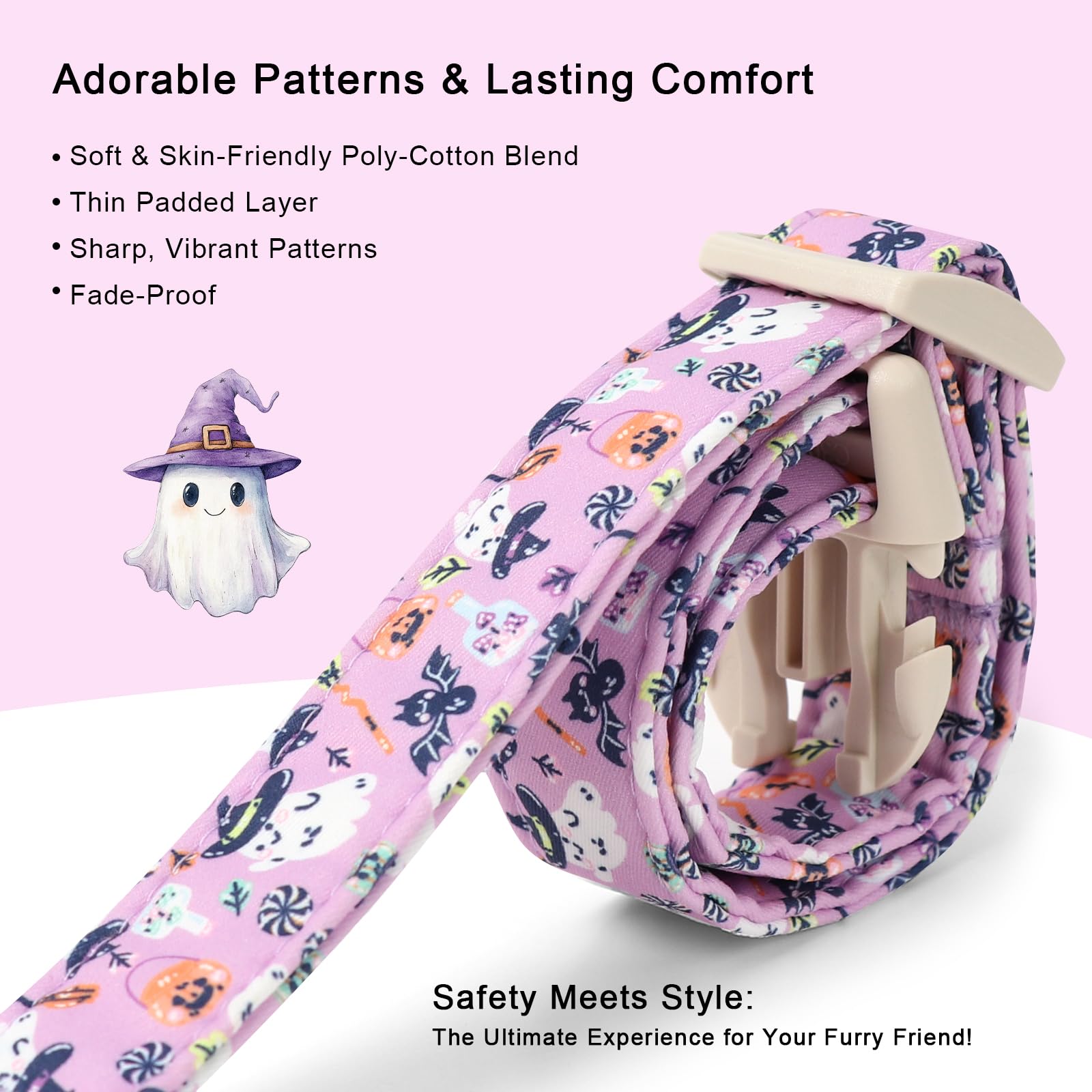 • Adorably Spooky Halloween Dog Collar: Playful purple sets off fluttering bats, playful pumpkins, candy, potions & witch-ghosts – perfect for trick-or-treat strolls & spellbinding after-dark adventures