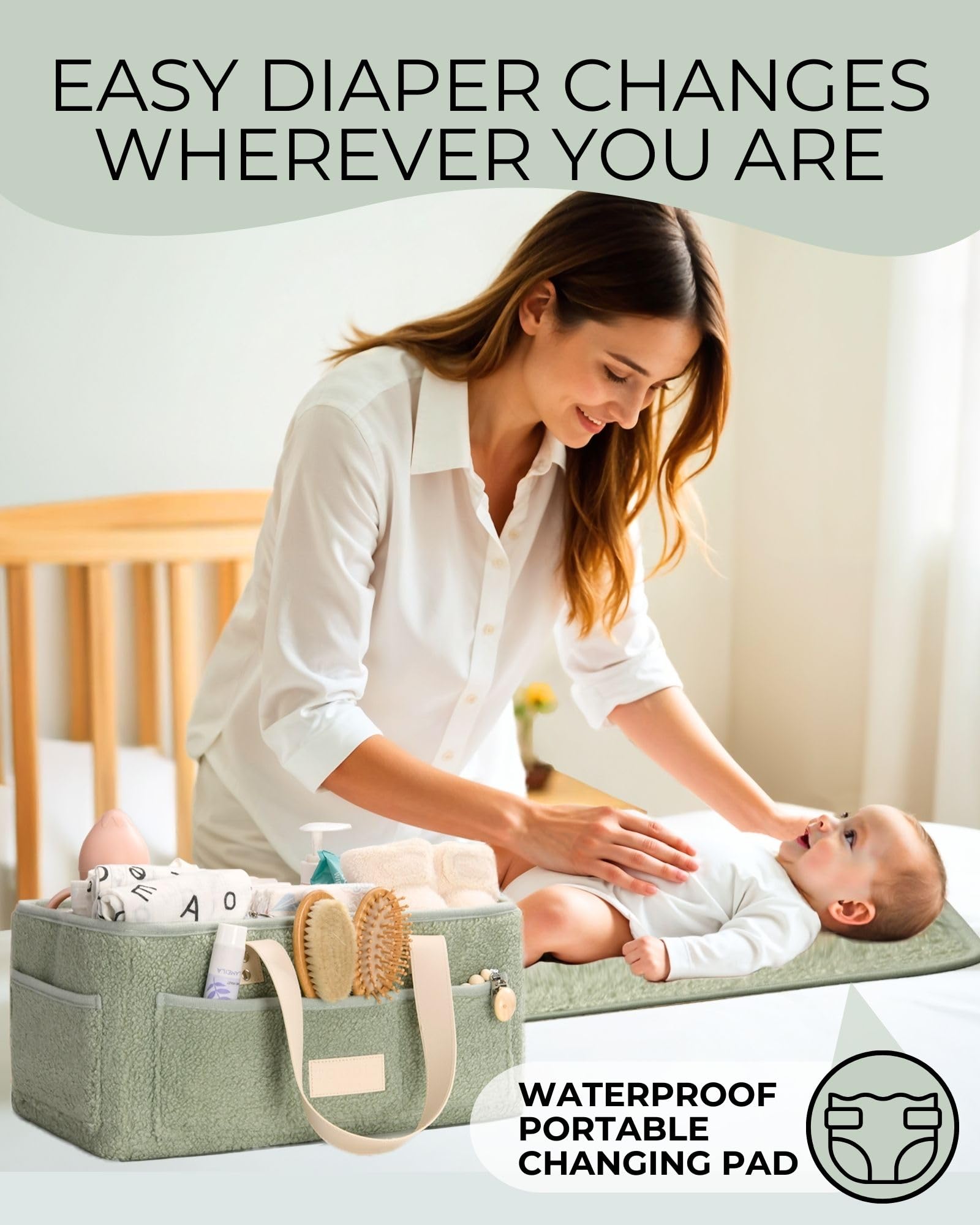Baby Diaper Caddy Organizer with Portable Changing Mat - Teddy Fleece Diaper Organizer for Changing Table - Baby Basket for Diaper Changing Essentials - Baby Caddy Organizer with Removable Dividers