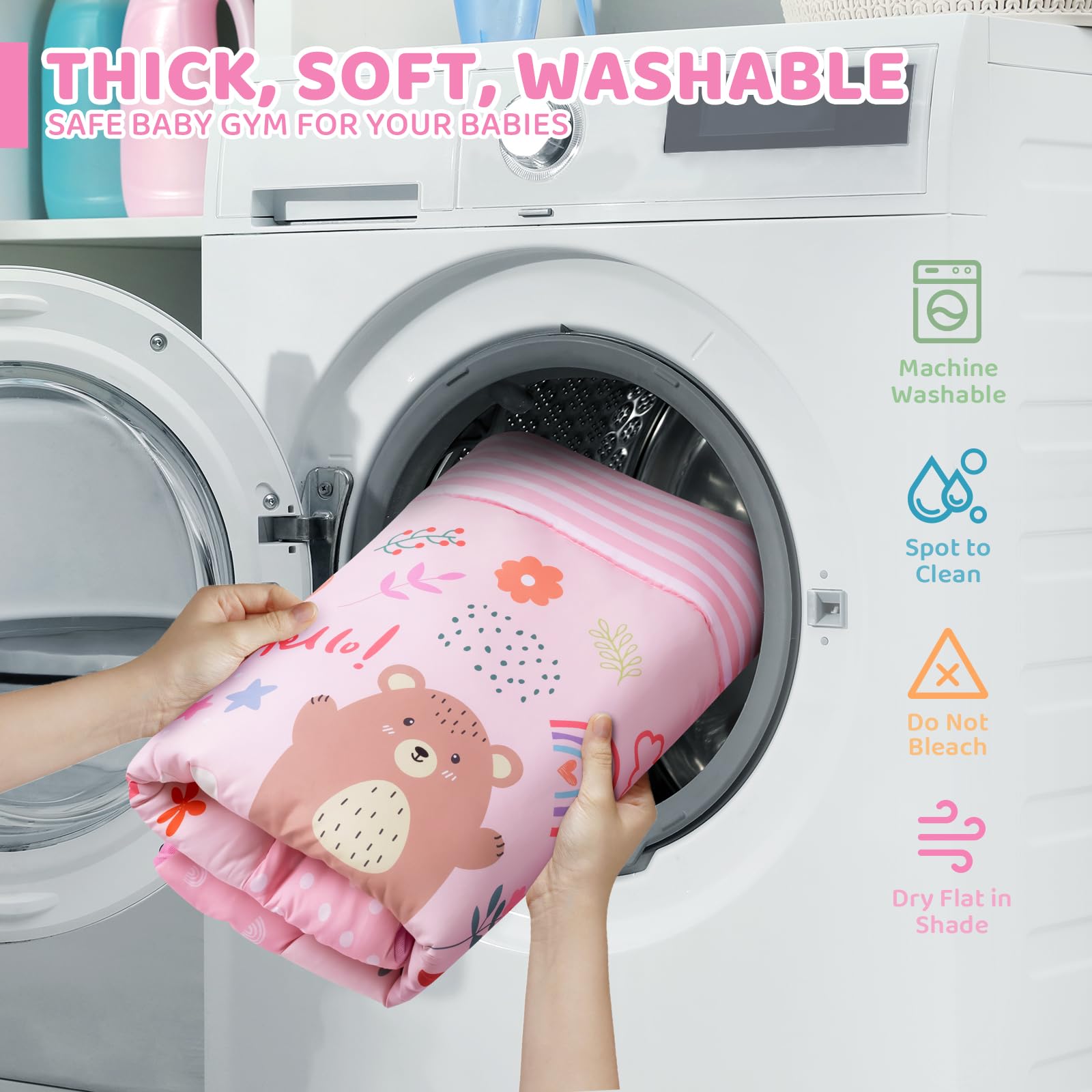 • Soft, Safe, and Washable - The baby gym play mat is made from high-quality fabrics, thick, delicate, and smooth touch, safe and comfortable for baby skins. Machine washable, easy to clean and keep hygienic. The tummy time activity mat can also be used directly on the floor, providing cushioning and protection for the baby. The balance of flatness and softness makes it more stable for babies to sit, stand and crawl.