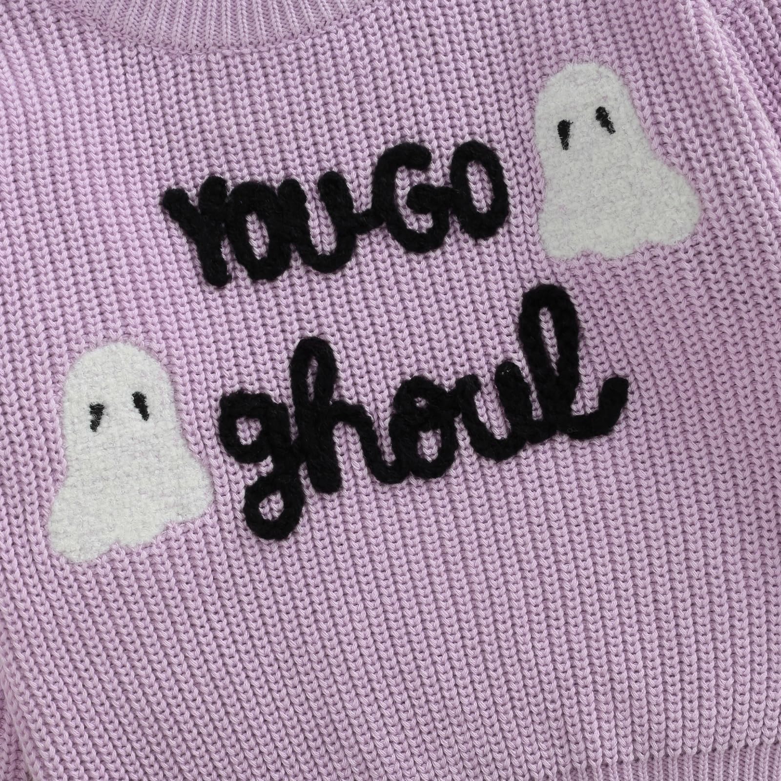 Baby Halloween Sweater Boy Girl Pumpkin Long Sleeve Crewneck Embroidery Knit Sweatshirt Toddler Pullover Tops (Ghoul Purple, 4-5 Years)