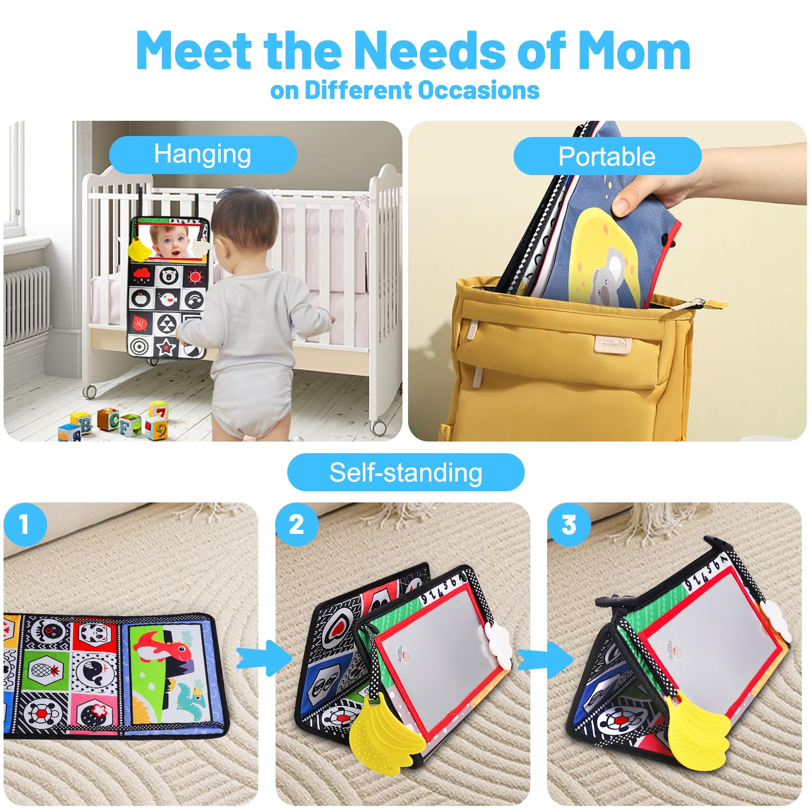 Baby Mirror Toys for Tummy Time, Newborn Infant 0 3 4 6 12 Months Old Boy, Girl Gift. Brain Developmental Montessori Sensory High Contrast Crinkle Book w Safe Mirror for Floor, Crib, Car, Bouncer