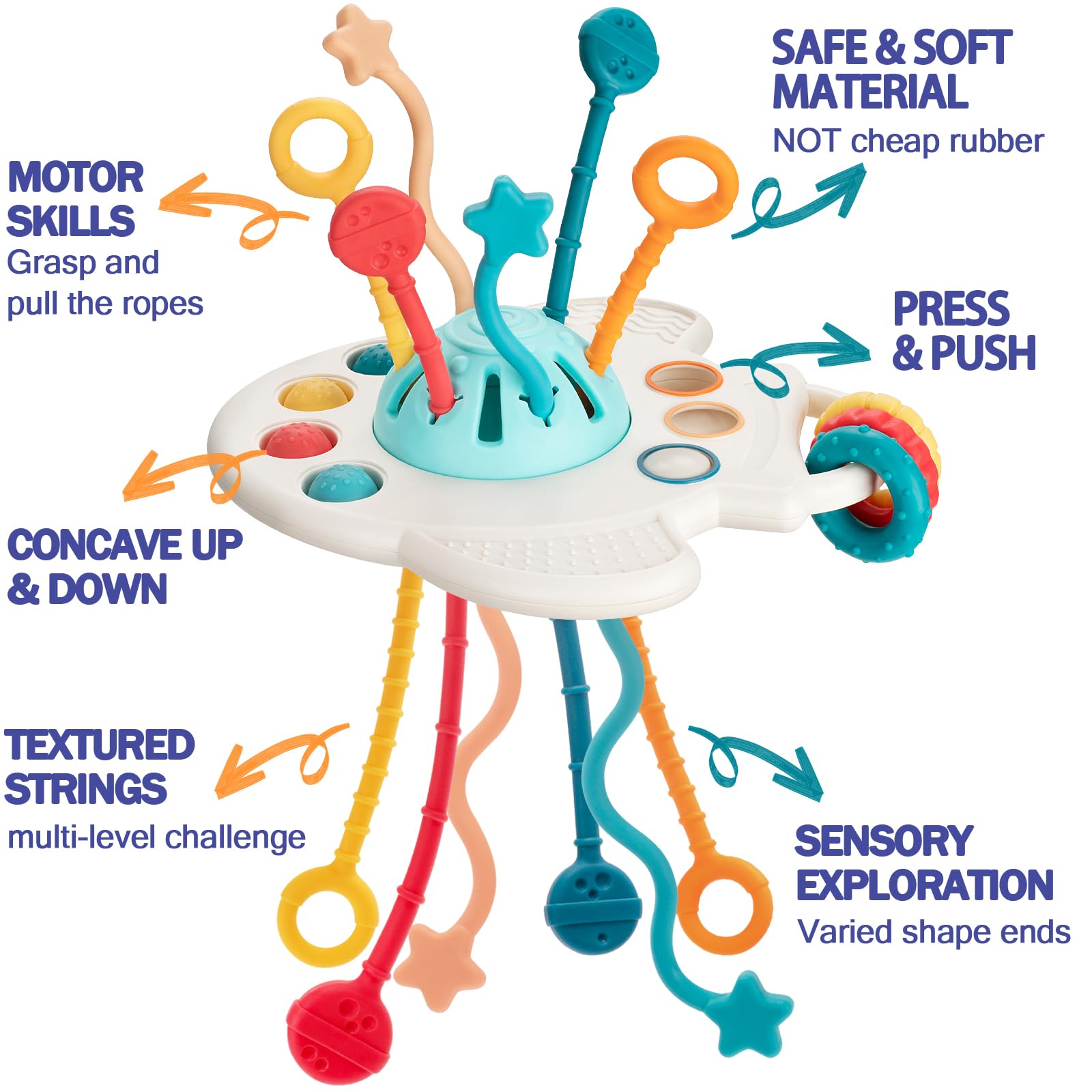 • Travel Pull String Toy - It has a very unique airplane design with 6 colorful silicone pull cords, pop bubbles, a sliding button ball, and a built-in jingle ball. Develop baby's motor skills and sensory perception by pulling up and down silicone ropes, pressing and pushing buttons. With an easy-to-hold/storage size, the developmental activity toy is great as a traveling toy to keep the baby entertained for hours.