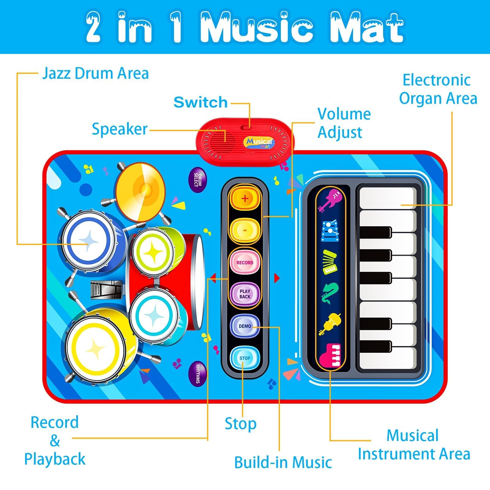 • MULTIFUNCTIONAL BABY TOYS: 2 in 1 Baby Music Playing Mat for 1 year old girl and boy help baby learn to play many different styles of music. The piano side has the sounds of 6 instruments (piano, violin, vibraphone, trumpet, accordion, guitar) and 13 piano keys. The drum side come with 2 drumsticks for fun drumming for 1 2 3 year old boys and girls enjoy playing the drum set. Wonderful piano play mat for baby, piano keyboard baby gifts, toddler valentines gifts, toddler easter gift idea.