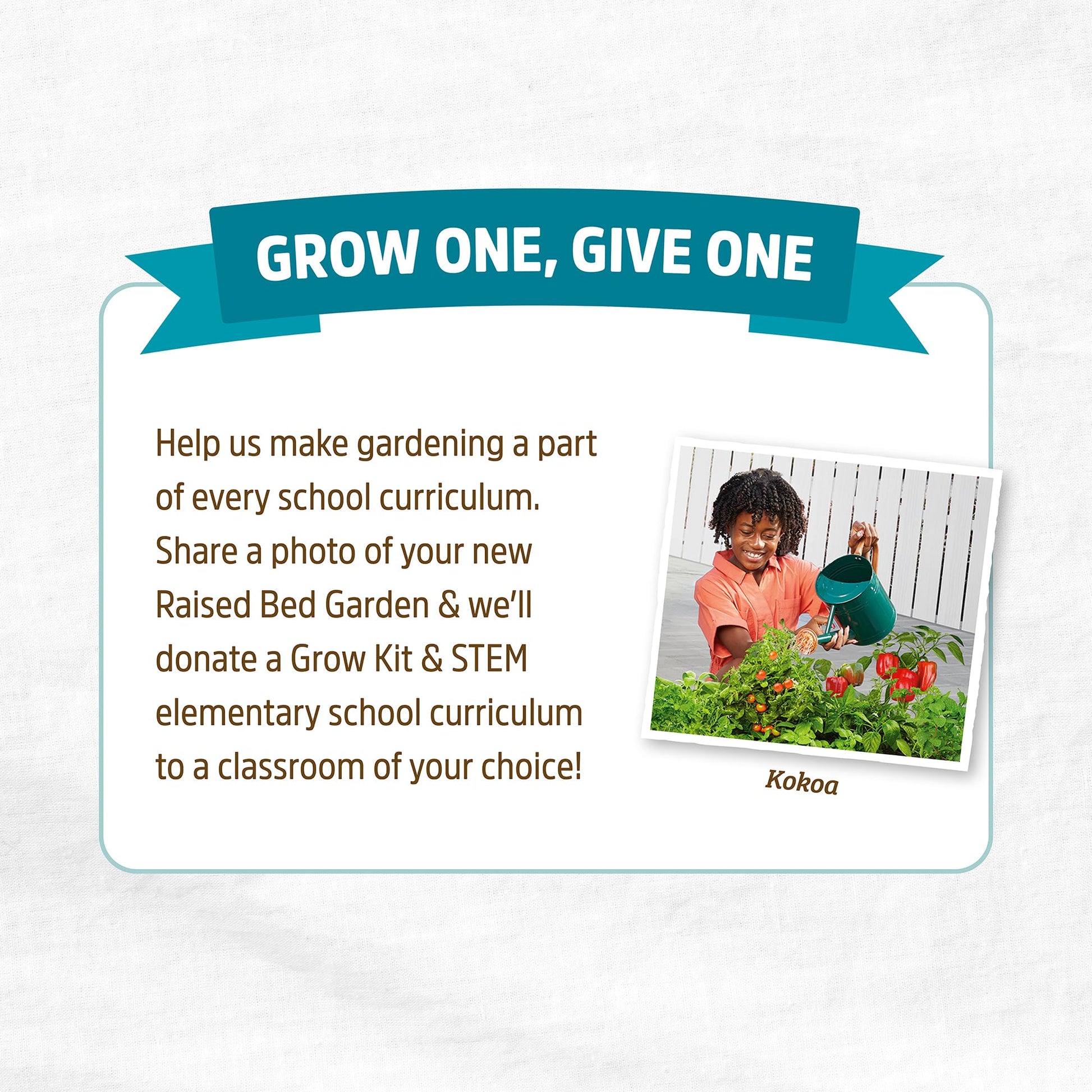 • #GROWONEGIVEONE — share a photo of garden with #GrowOneGiveOne and we'll donate an organic gardening kit + STEM curriculum to an elementary school classroom of your choice!