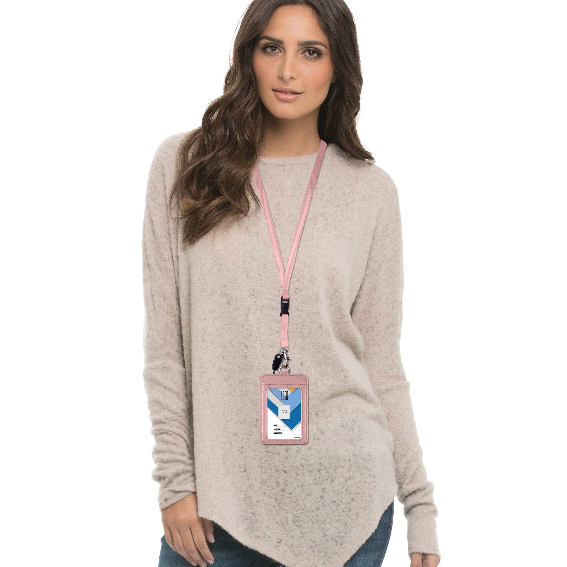 Badge Holder, Wisdompro 2-Sided PU Leather ID Badge Card Holder Wallet Case with 1 Clear ID Window and 1 Credit Card Slot and 22 Inch Quick Rlease Detachable Neck Lanyard Strap-Rose Gold (Vertical)