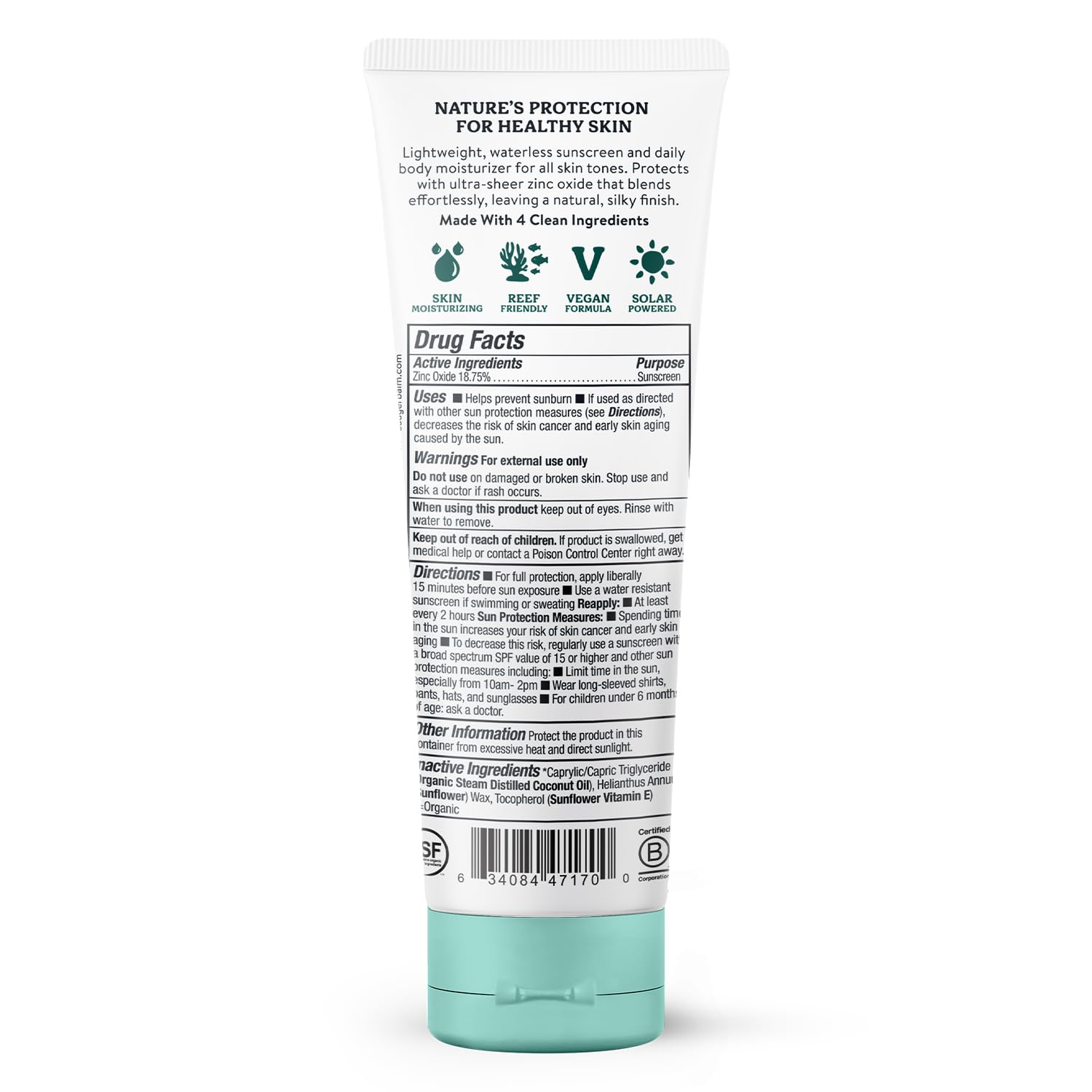 • 90% ORGANIC INGREDIENTS: Natural sunscreen lotion protects & nourishes with just 4 ingredients: zinc oxide, coconut oil, sunflower wax, vitamin E. Unscented, chemical free, reef safe, vegan sunscreen