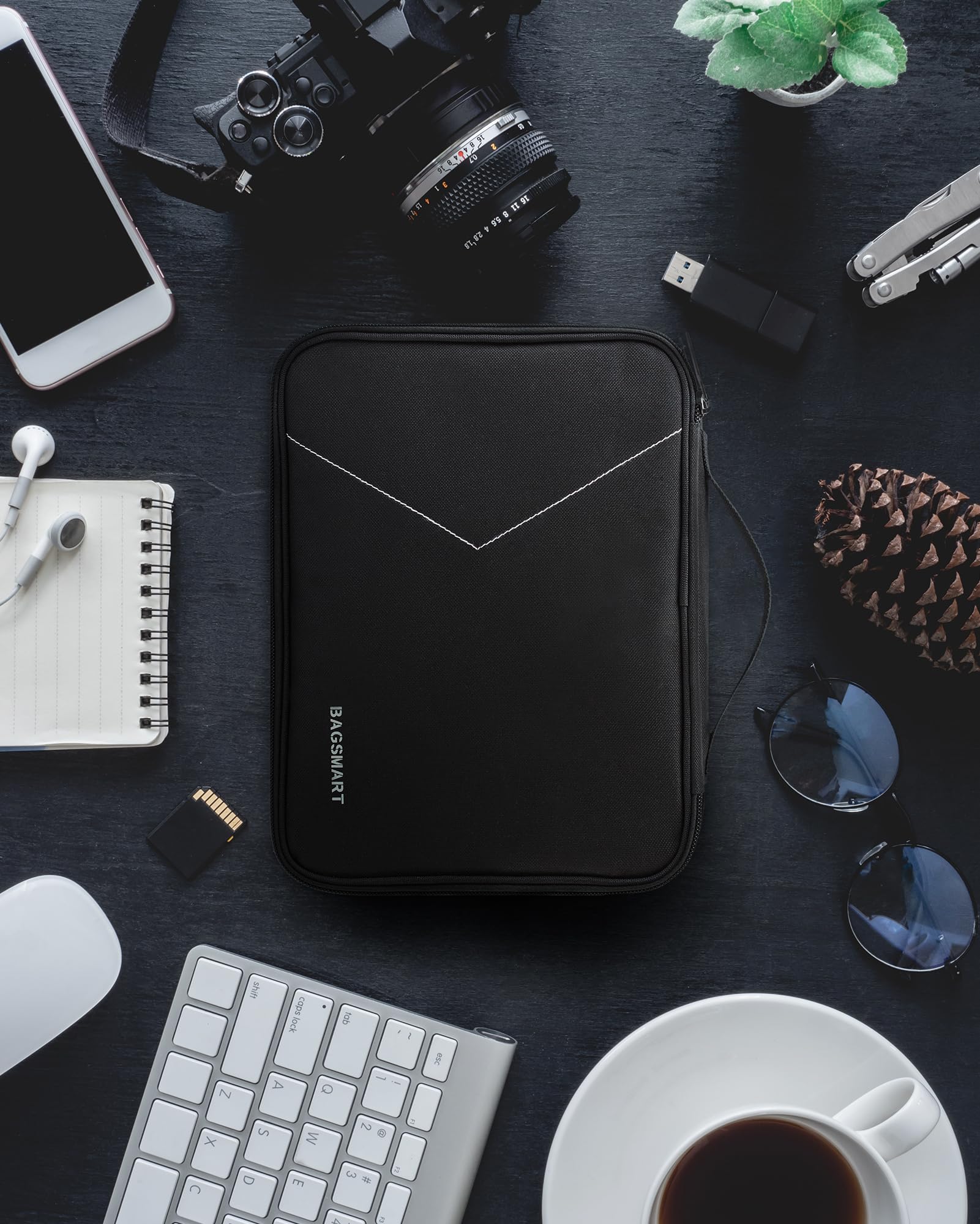 • Storage Capacity: This travel electronics organizer is designed with multiple pockets and various size of elastic bands providing great flexibility for organizing electronics accessories such as USB cables, stylus pens, flash drive, wall charger, SD card, Hard Drive, Power Bank, Earbuds, It is the answer to your audio/video/power cord storage problems, With tablet compartment suitable for iPad pro, kindle
