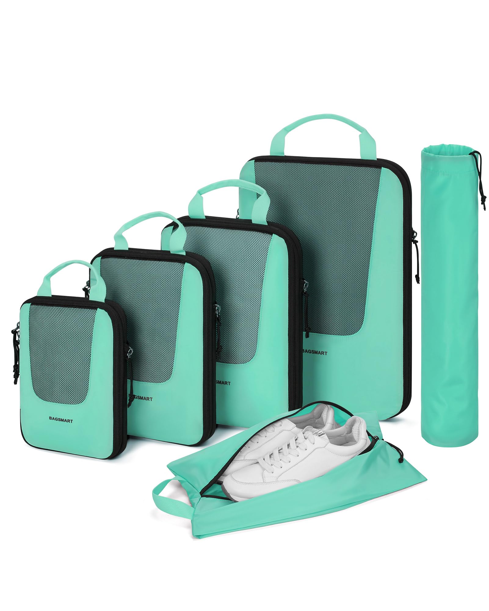 • Compression Packing Cubes - Are you fed up with the travel kind of messy suitcase? Travel with BAGSMART PACKING CUBES and they make a world of difference. The 6-piece packing cubes contains 4 travel cubes + 1 laundry bag + 1 shoe bag, keeps your outfits in separate compression cubes, and makes your luggage clean and neat while traveling