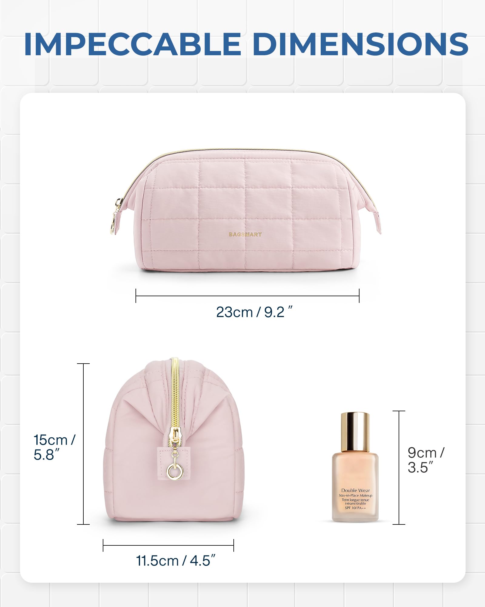 BAGSMART Makeup Bag Travel Toiletry Bag, Puffy Padded Make Up Bags for Women Makeup Organizer Case, Wide-open Pouch Purse Travel Essentials Toiletries Accessories Brushes, Pink