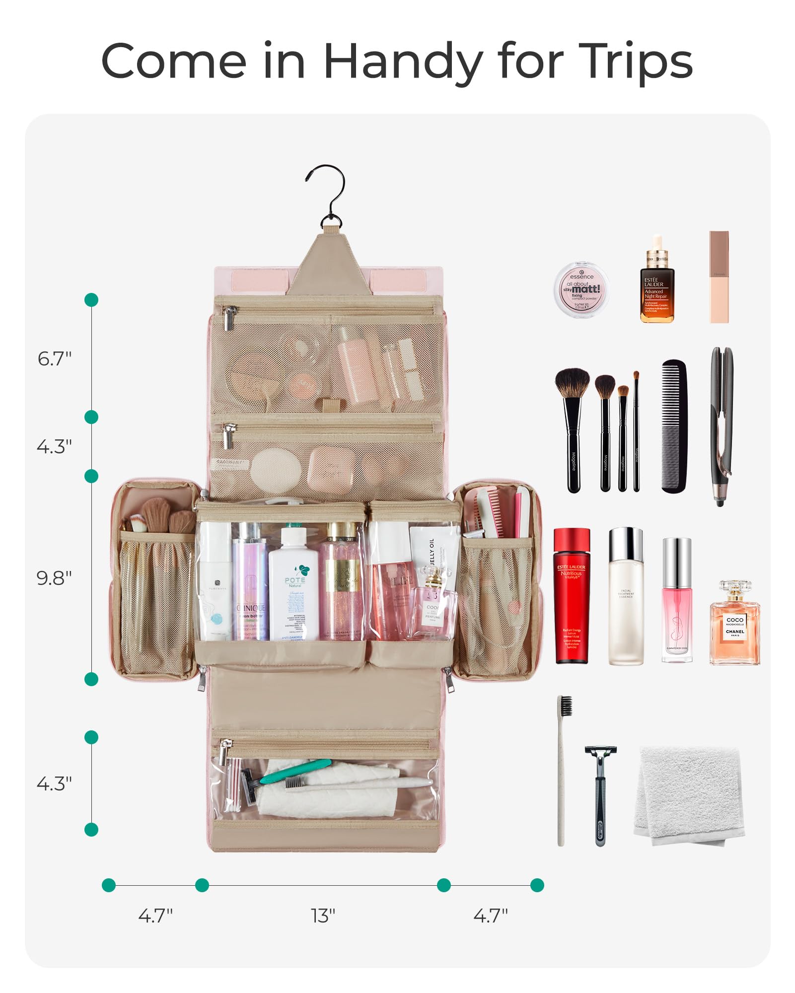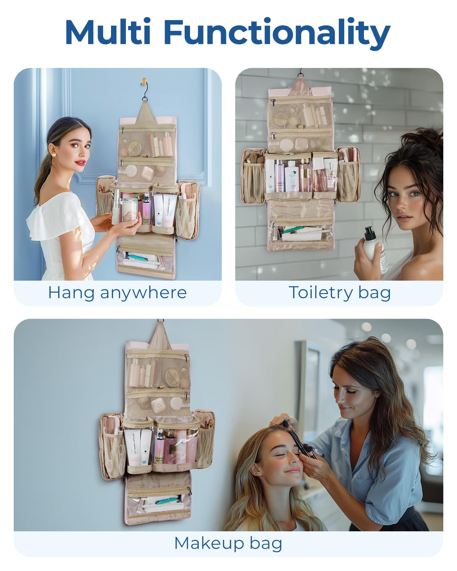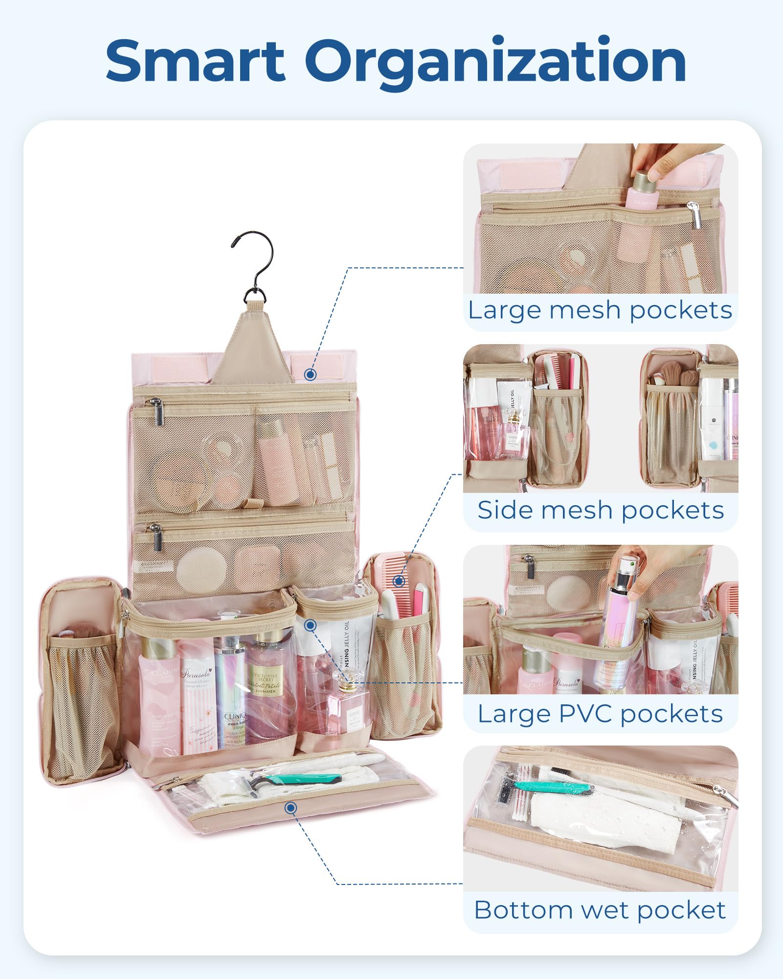 • Full Opening and Keep Upright : Full opening for easy access to items. Each compartment of the hanging toiletry bag keeps cosmetic bottles and toiletries can stand upright and keep organized. Find the item you need in one second.
