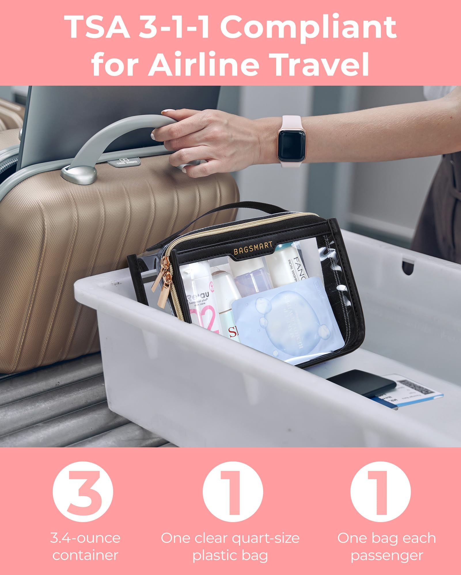 BAGSMART TSA Approved Toiletry Bag, Clear Travel Toiletry Bag, Makeup Cosmetic Pouch Bag for Women Quart Size Compliant Bag Organizer for Travel Essentials (Black Pack of 1,)