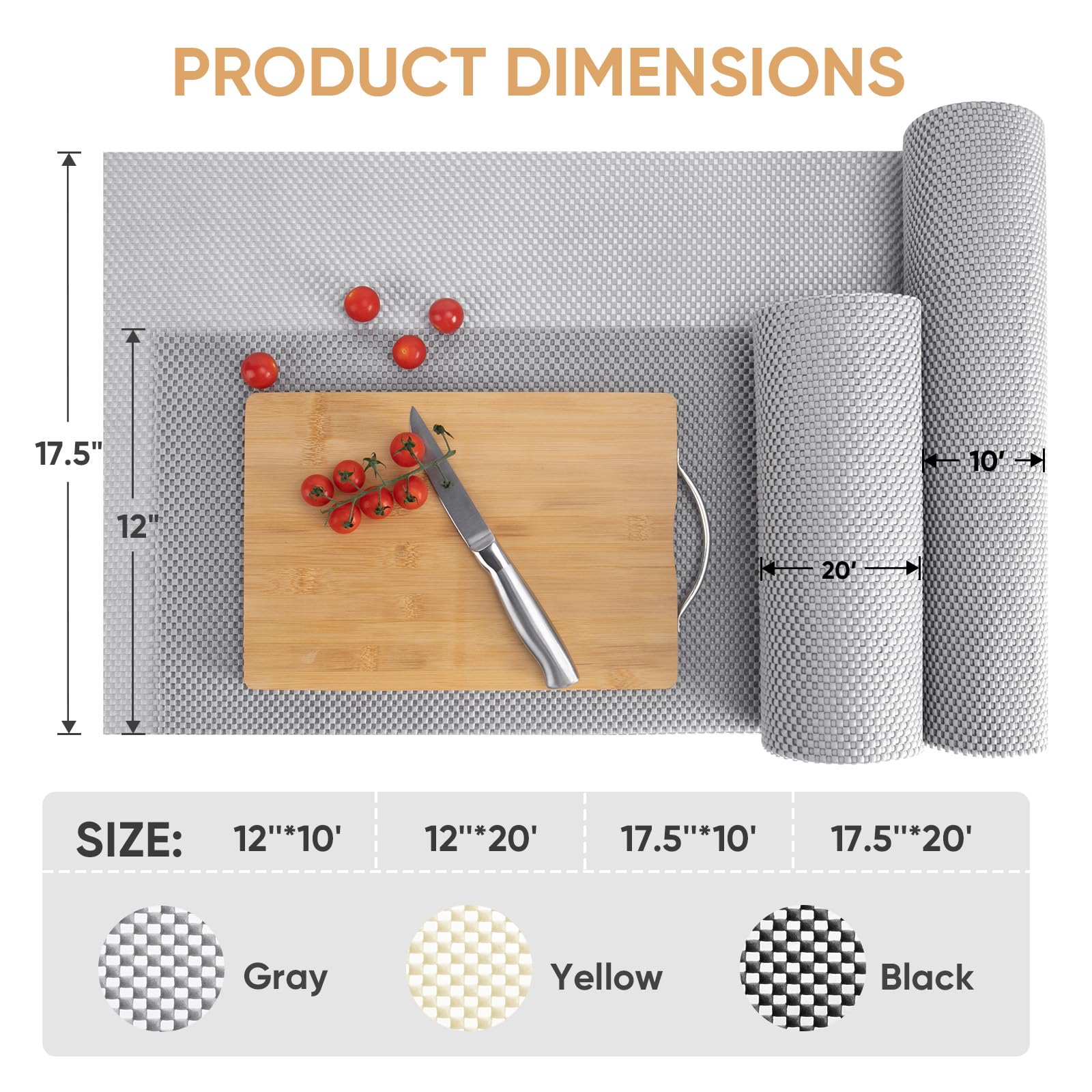 • [EASY TO USE & CLEAN] The shelf liner comes in 4 sizes for your choice, 12''x10', 12''x20', 17.5'x10', and 17.5''x20'. It can be easily cut to size as needed, making installation quick and hassle-free. Cleaning is simple, just wipe away dirt with mild soap and a damp cloth.
