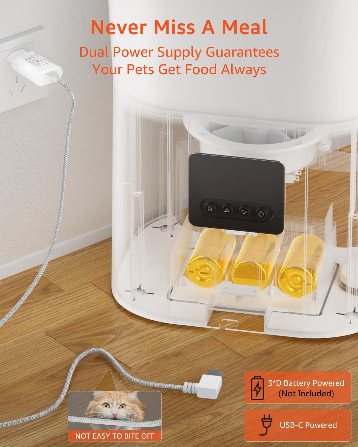 • Dual power mode: the cat feeder supports two power sources, the power adapter and the 3D battery (not included). The feeder can work normally even after a power failure. And the cat feeder has a memory function that does not need to be reset to continue working after power failure and restart.