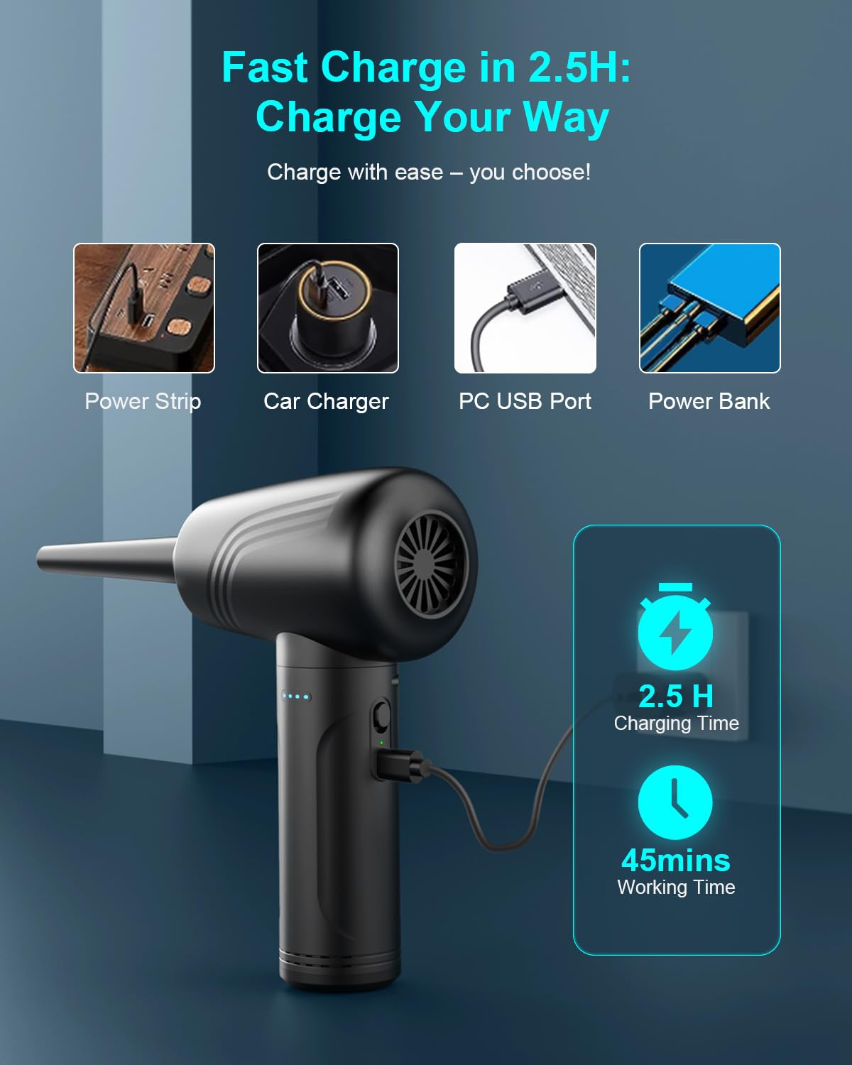 • Charge Anywhere, Anytime: Convenience is key, and Bankky computer air duster delivers. Charge it effortlessly with the included 2A USB C-A data cable using wall sockets, car chargers, computer USB ports, or portable power banks. It's a speedy 2.5-hour recharge – always ready to bust some dust!