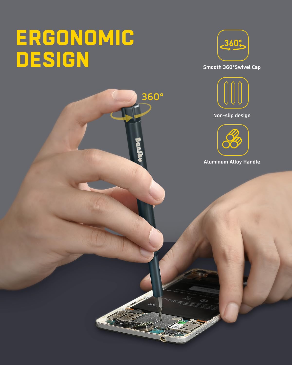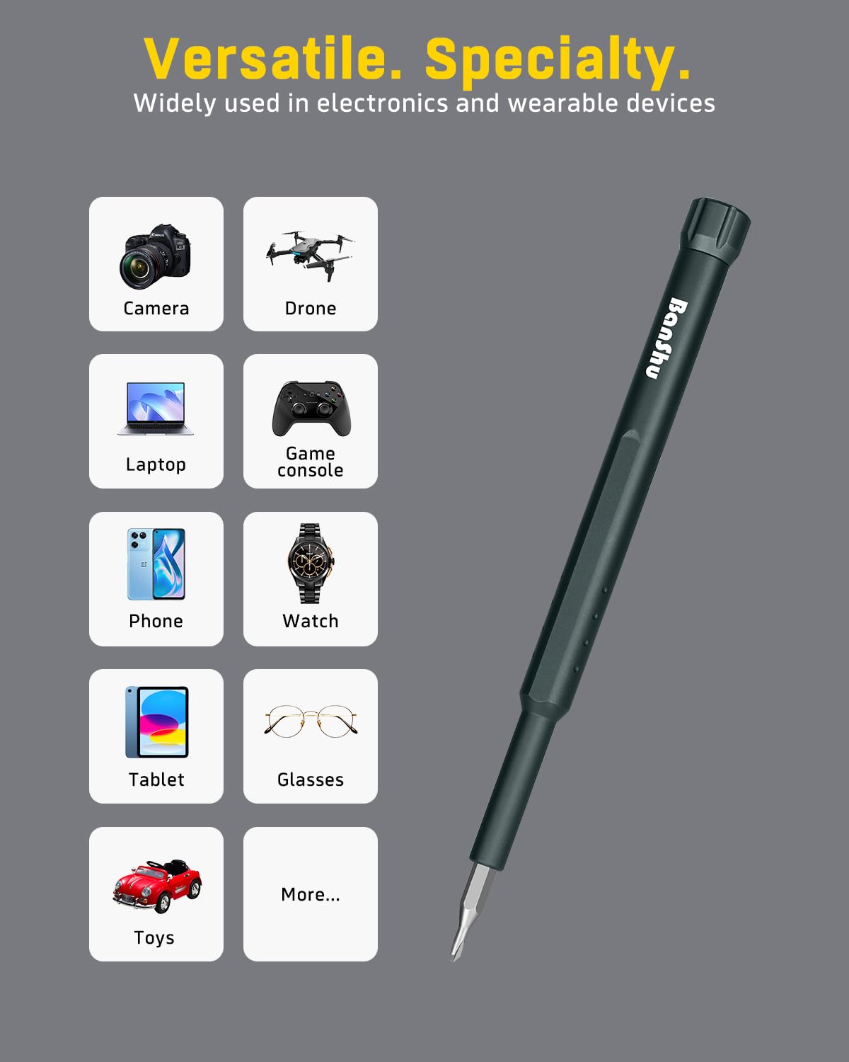 • 46 IN 1 MULTI-PURPOSE, HOUSEHOLD MUST-HAVE: Banshu precision screwdriver set includes 12 types of bits (Torx, Hex, Star, Flathead, Phillips, Pentalobe, Square, Triangle, etc.), which can be used to repair all kinds of electronic products and wearables, such as MacBooks, PCs, cameras, PS4, PS5, Switch, gaming consoles, eyeglasses, laptops, tablets, cell Phones, watches, jewelry, drones, ring video doorbells, and more. It also comes with the usual pry bar and tweezers, ensuring you have a complete mini repair kit.
